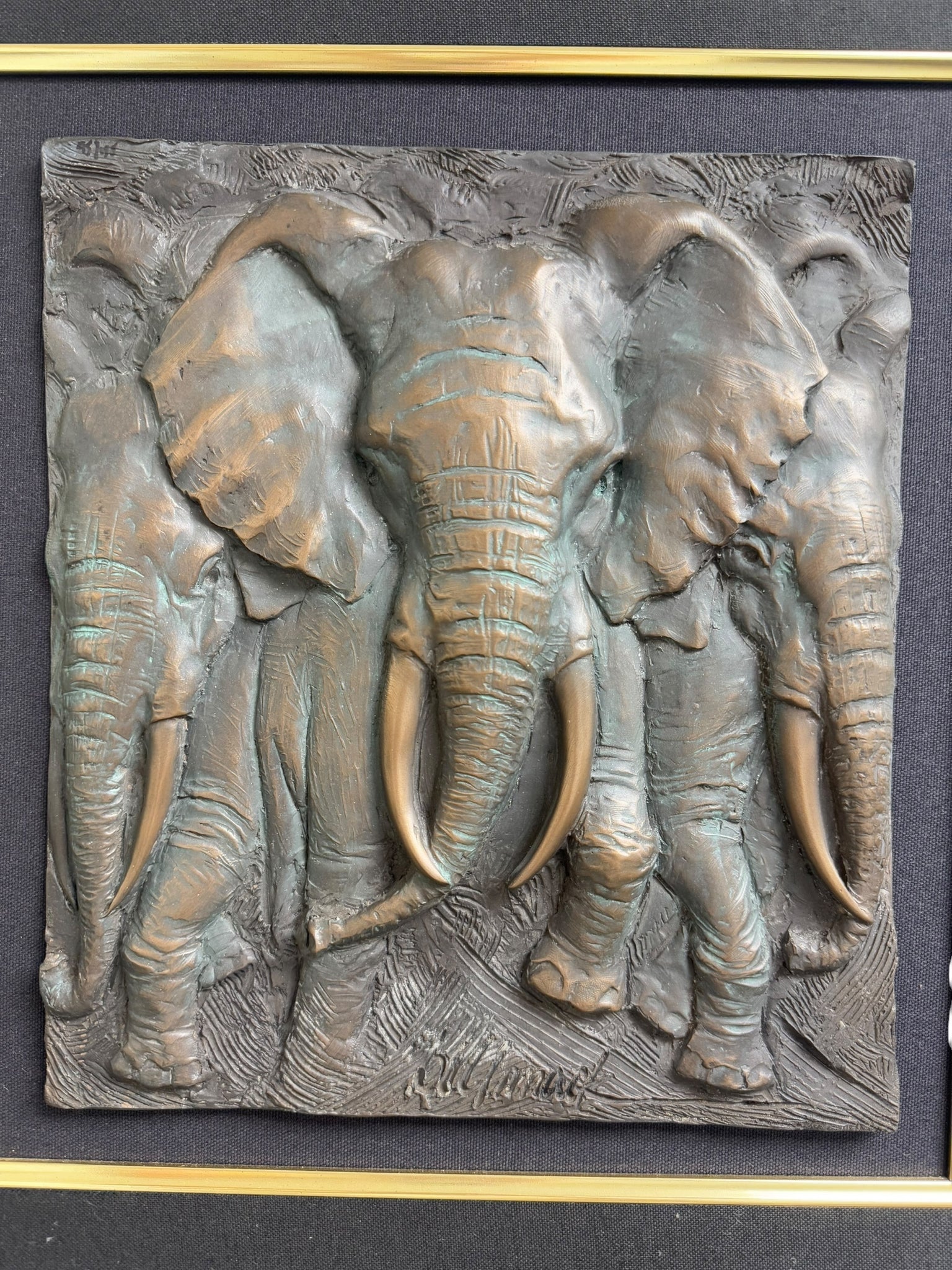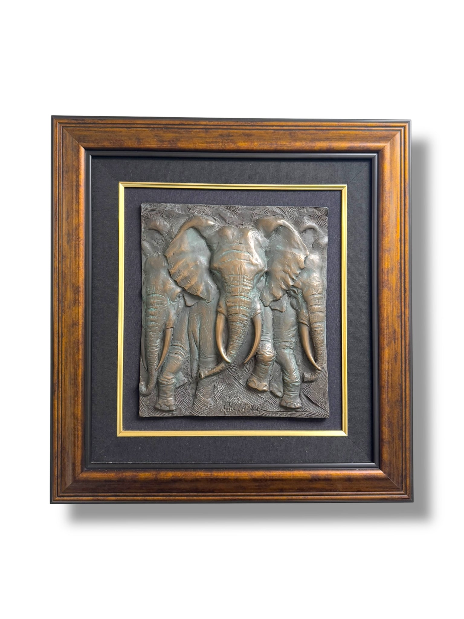 DescriptionA stunning dimensional work by renowned artist Bill Mack, this elephant relief sculpture captures strength, movement, and presence in beautifully sculpted detail. The trio of elephants emerges from the textured surface with remarkable depth, finished in rich bronze tones with subtle patina highlights that enhance the lifelike quality. The piece is elegantly presented in a substantial wood frame with black matting and a gold accent liner, giving it a classic, gallery-ready appearance. Pre-loved and in excellent condition with minimal wear to the frame. A sophisticated statement piece perfect for collectors or anyone drawn to wildlife art, texture, and timeless craftsmanship.