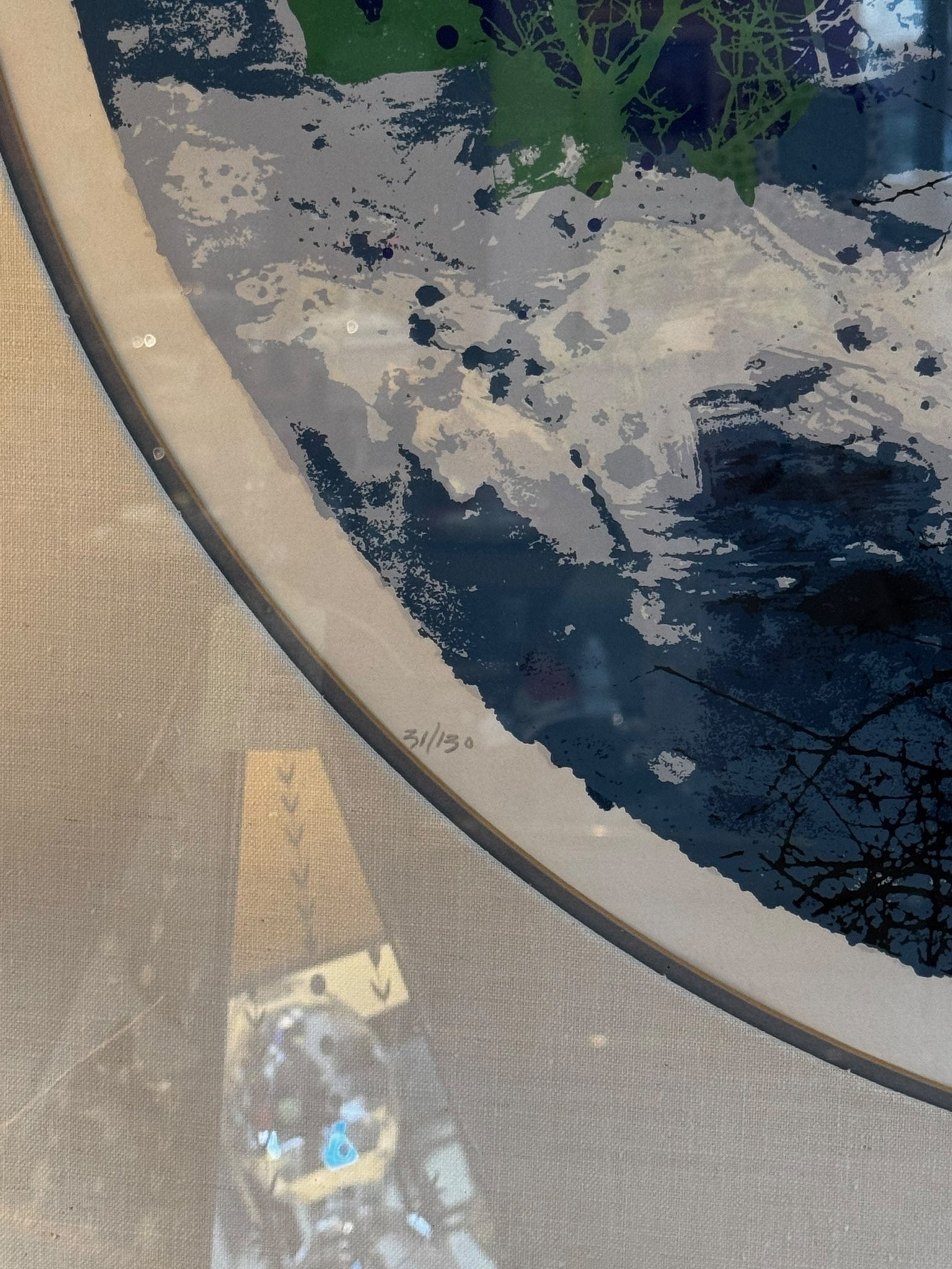 Description: Bring a touch of modern expression and organic texture to your space with this striking framed artwork, signed by the artist and numbered 31/130. Featuring a dynamic blend of deep blues, soft greys, and layered greens, the composition evokes natural landscapes through abstract brushwork and the silhouette of intricate tree branches. The circular artwork is beautifully mounted against a linen-style mat and set within a sleek black frame, creating a gallery-worthy presentation that feels both contemporary and timeless. Perfect for adding depth to living rooms, entryways, or office spaces, this limited-edition piece offers a unique opportunity to own a collectible work with authentic character and visual impact. Art is pre-loved but in good condition.