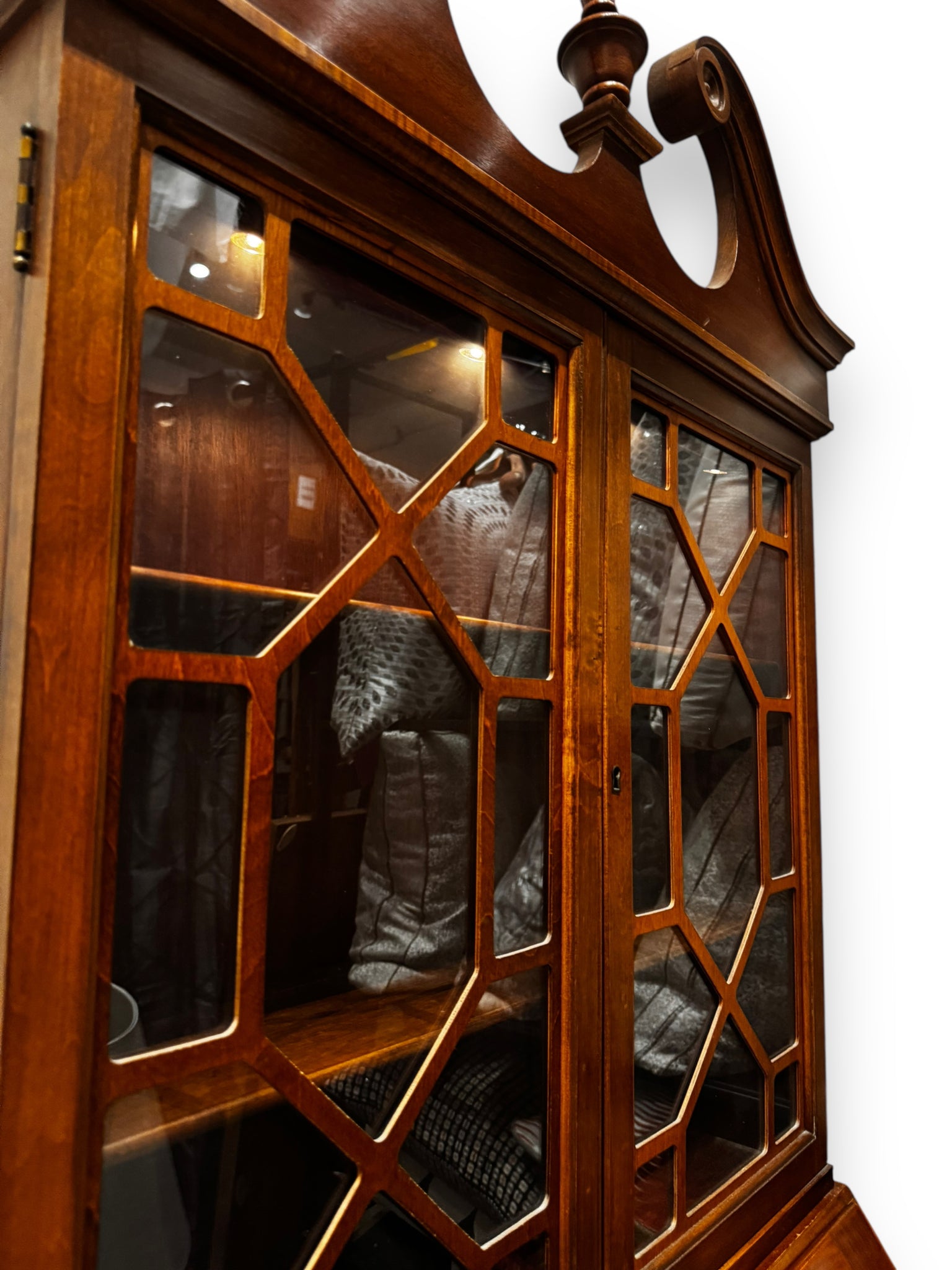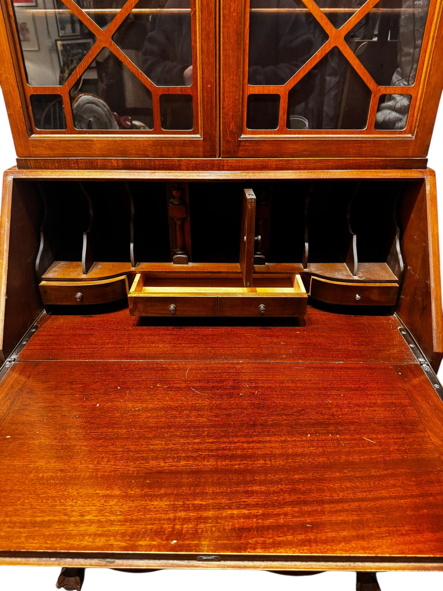 Description: A timeless piece of American craftsmanship, this vintage secretary desk by Maddox of Jamestown embodies the elegance and artistry of fine 20th-century furniture making. The rich mahogany finish and graceful serpentine front highlight its distinguished colonial revival design, while the illuminated glass-paneled hutch adds both beauty and functionality. The upper cabinet features delicate mullioned glass doors that open to reveal adjustable shelving and built-in interior lighting — perfect for displaying fine books, china, or collectibles. Below, the drop-front writing surface folds down to create a refined workspace, complete with compartmentalized cubbies and petite drawers for stationery and keepsakes. Four spacious, dovetail-joined drawers offer generous storage, each adorned with antique-style brass hardware. The piece rests on ball-and-claw feet, lending a stately finish to its silhouette. Marked inside the drawer with the Maddox of Jamestown maker’s emblem, this heirloom secretary blends beauty, utility, and enduring craftsmanship — ideal for a sophisticated study, living room, or library. Secretary is pre-loved but in good, vintage condition.