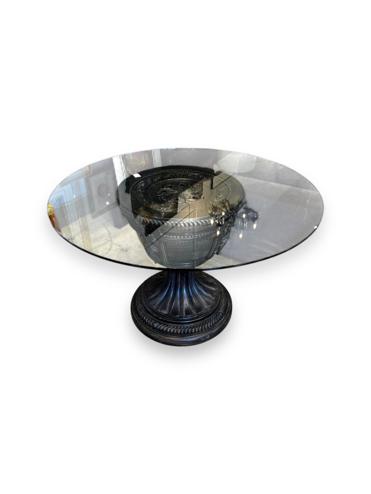 Description: This striking pre-loved table blends classical design with modern elegance. The pedestal base, crafted in a sculptural urn-inspired form, features intricate detailing and a deep charcoal finish with subtle patina that enhances its vintage appeal. The beveled round glass top rests gracefully on the base, creating a balanced contrast between transparency and texture. Perfect as a statement dining table, grand entryway piece, or conversation-starting center table—this design brings timeless sophistication and artistry to any interior.