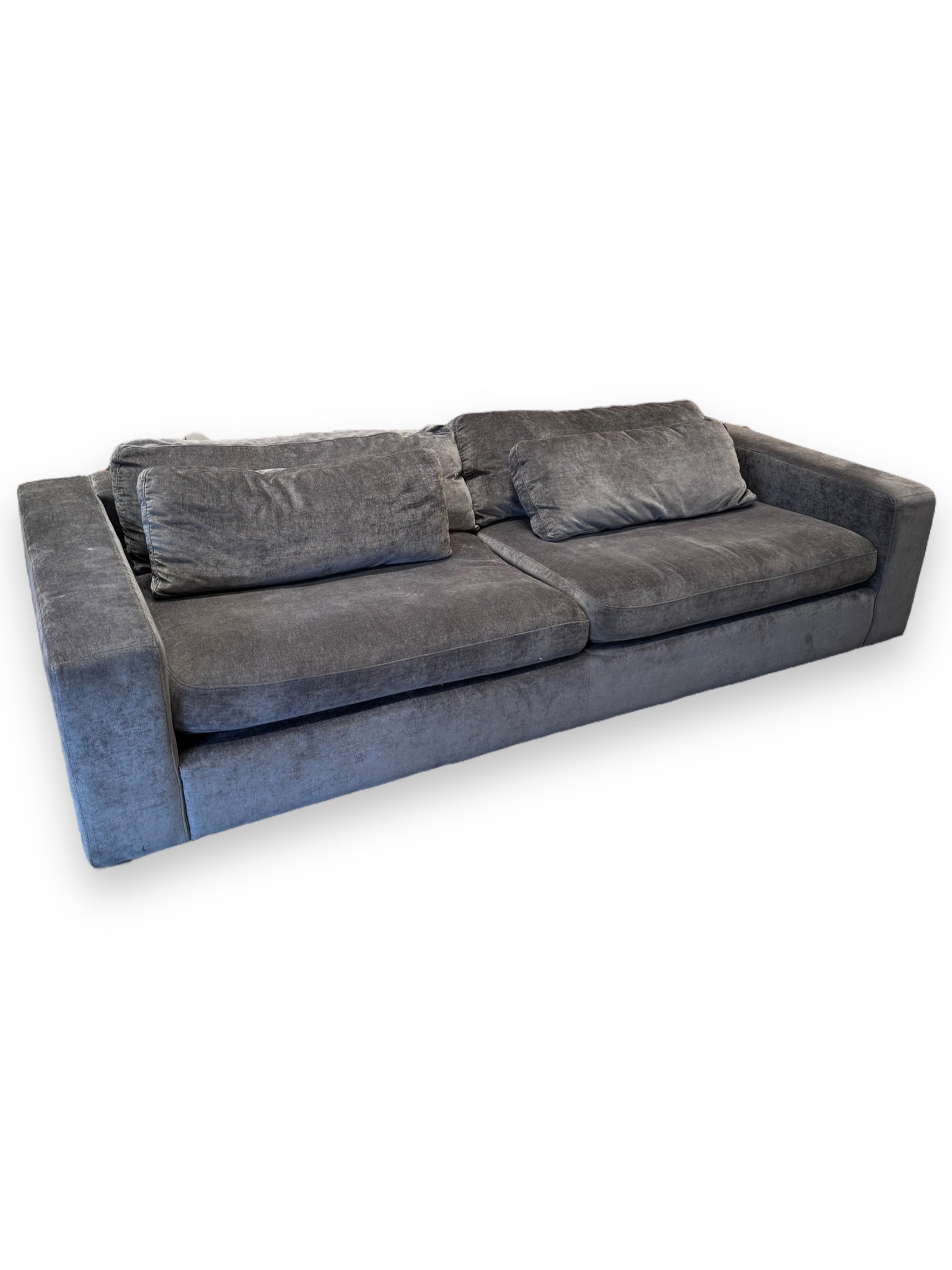 Description: This gray velvet-style couch embodies modern comfort with an effortlessly chic edge. Its low-profile design and deep, plush seating make it the ideal spot for lounging, relaxing, or hosting friends. The rich velvet-like fabric offers a soft, tactile feel and a subtle sheen that enhances the piece’s luxurious presence. Generous back cushions and wide track arms create a cozy yet contemporary silhouette, blending form and function beautifully. The cool gray tone adds a refined neutrality, pairing seamlessly with both warm and cool palettes. Perfect for those who appreciate style without sacrificing comfort, this sofa brings a relaxed sophistication to any living space. Sofa is pre-loved but in good condition.