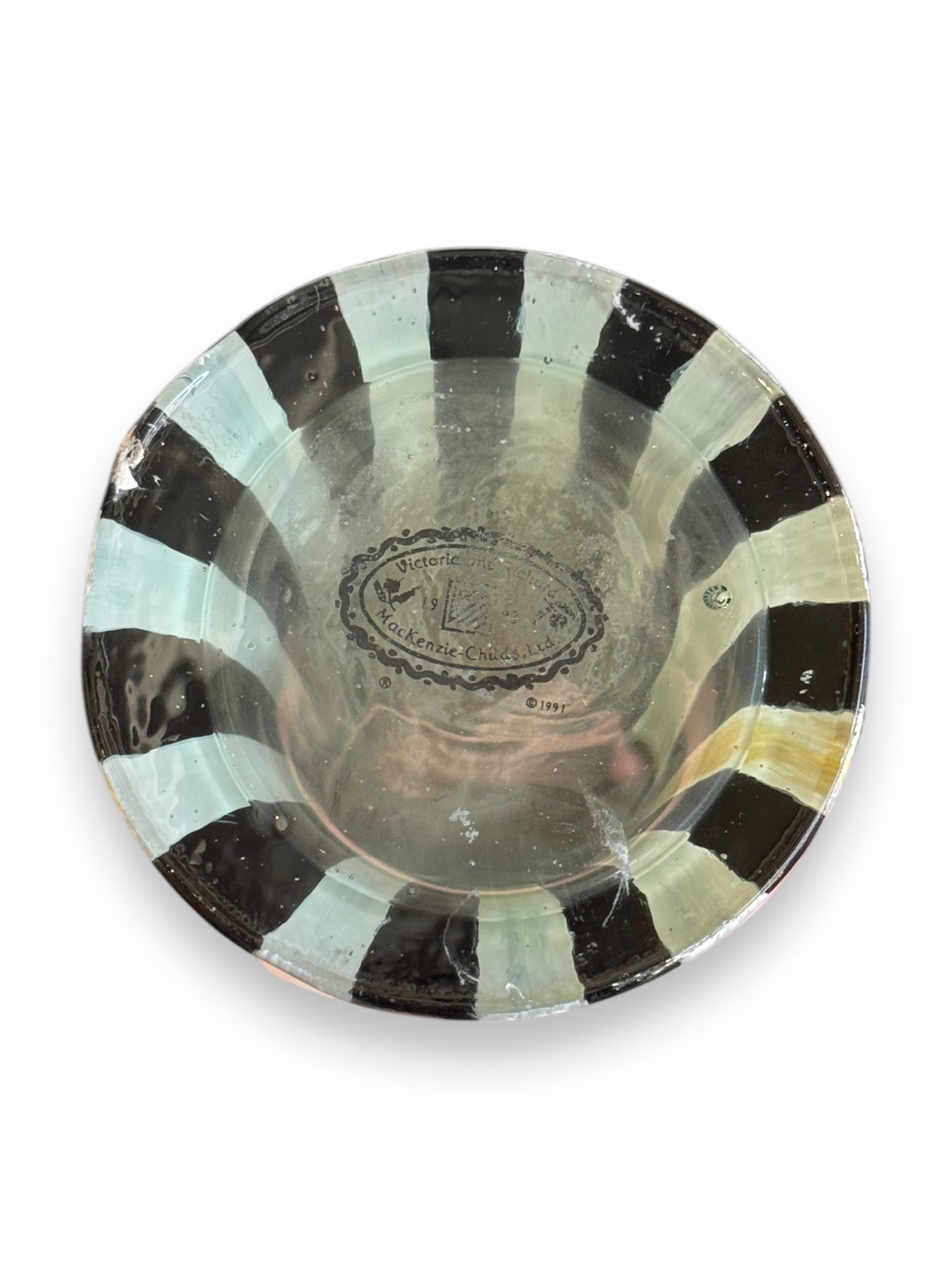 Description: This whimsical MacKenzie-Childs vase captures the brand’s signature charm with its playful mix of pattern and color. Featuring hand-painted black and white stripes paired with bold amber and gold accents, the design strikes the perfect balance between sophistication and fun. Crafted with exquisite detail, this sculptural glass vase makes a stunning centerpiece or statement display piece. Pre-loved and in great condition, it’s a true collectible that brings personality and artistry to any space.