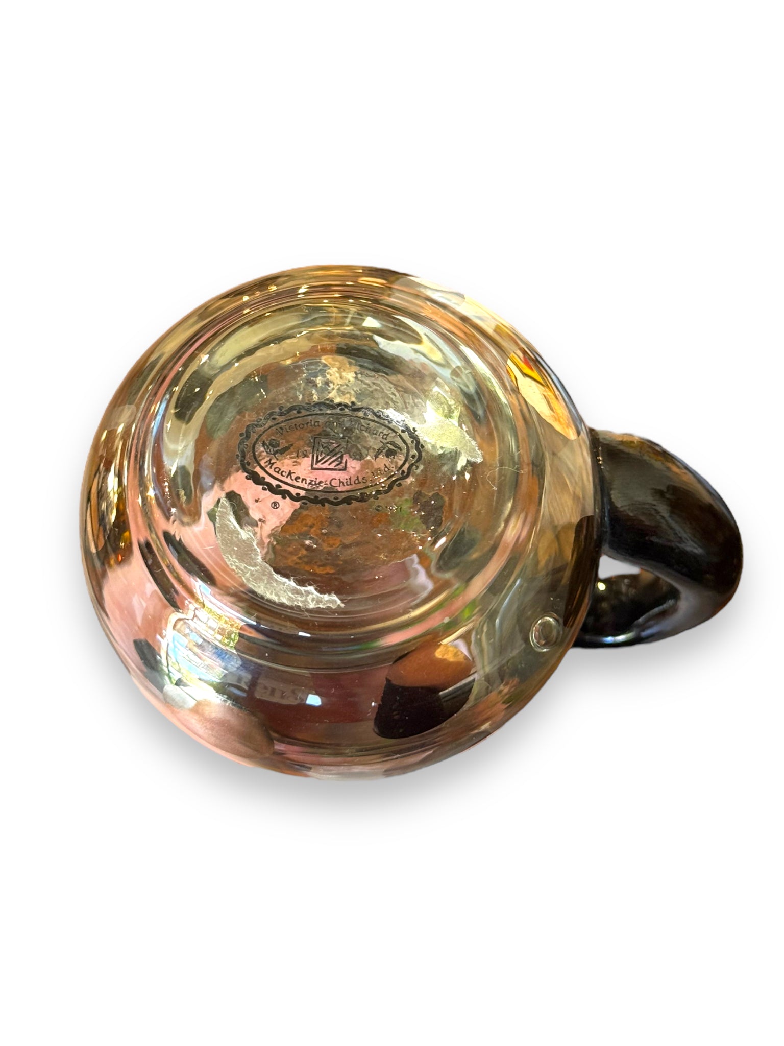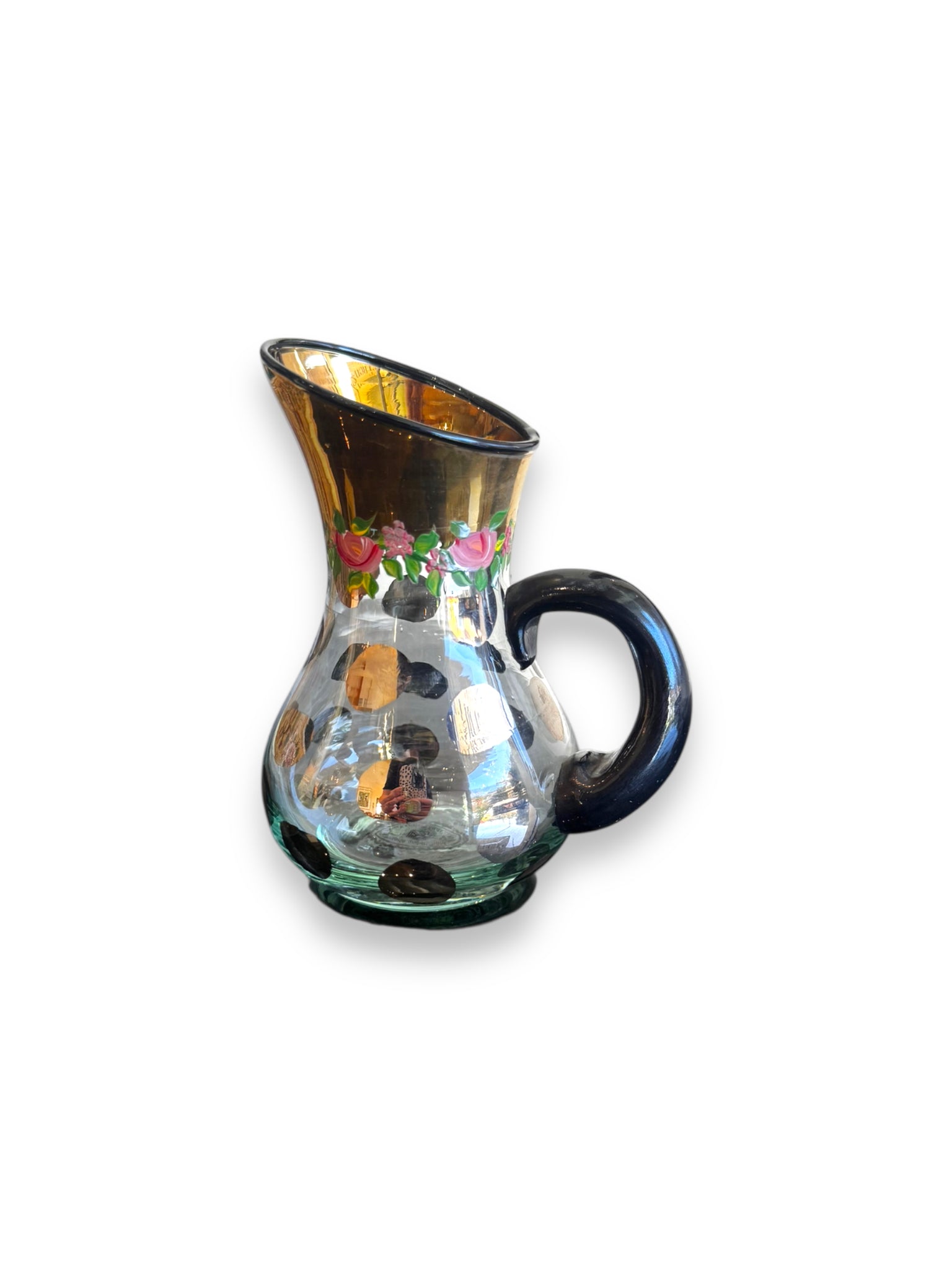 Description: “Jeremy’s” Jug from the whimsical circus collection by MacKenzie-Childs. This hand painted small glass pitcher is painted in gold, with lovely flowers and all over silver polka dots. Pitcher is pre-loved but in good condition.