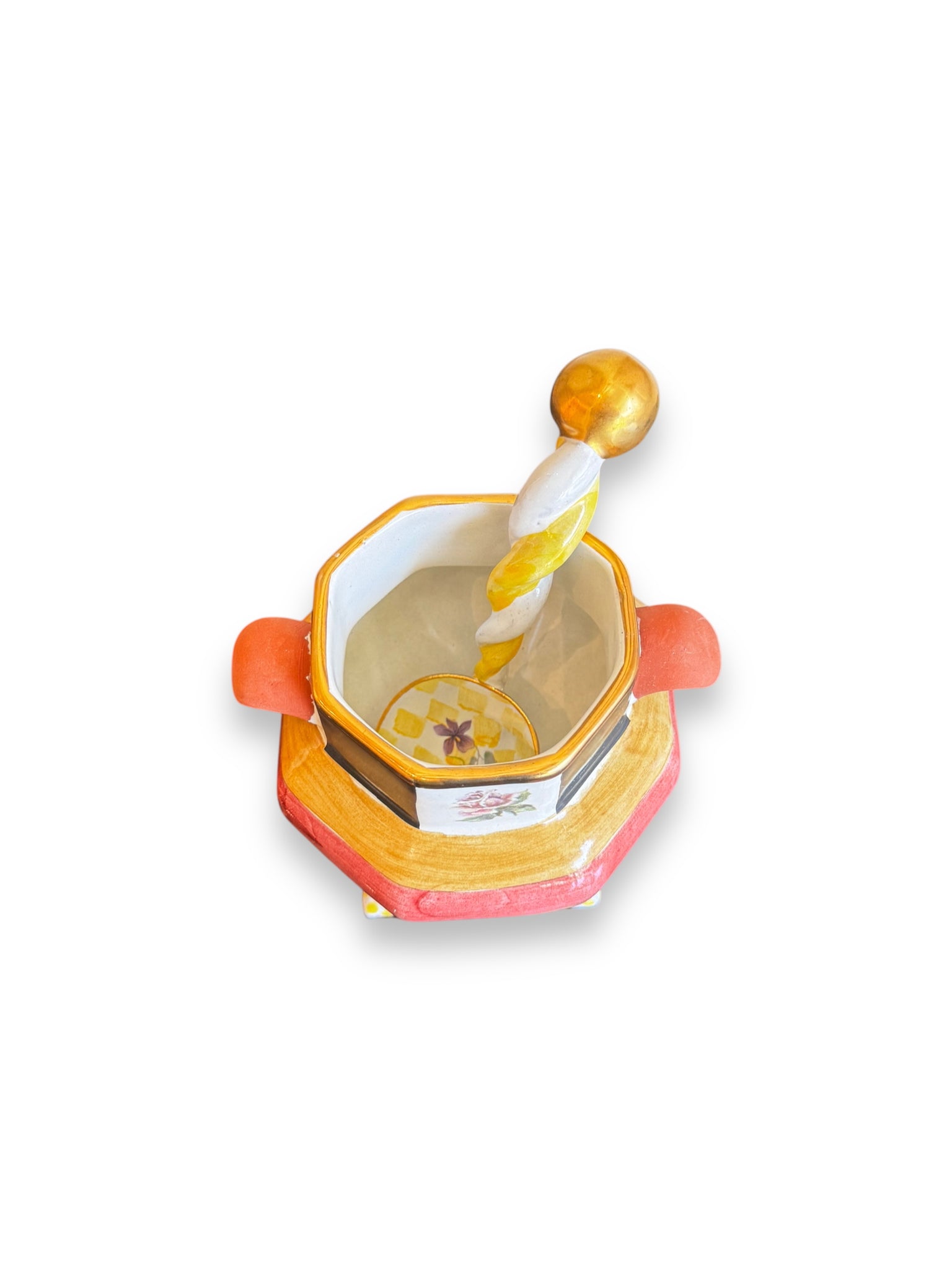 Description: Mackenzie Childs Sea and Shore Frank and Mustard sugar dish with lid and spoon. Pre-loved and in good condition. Signed on bottom.