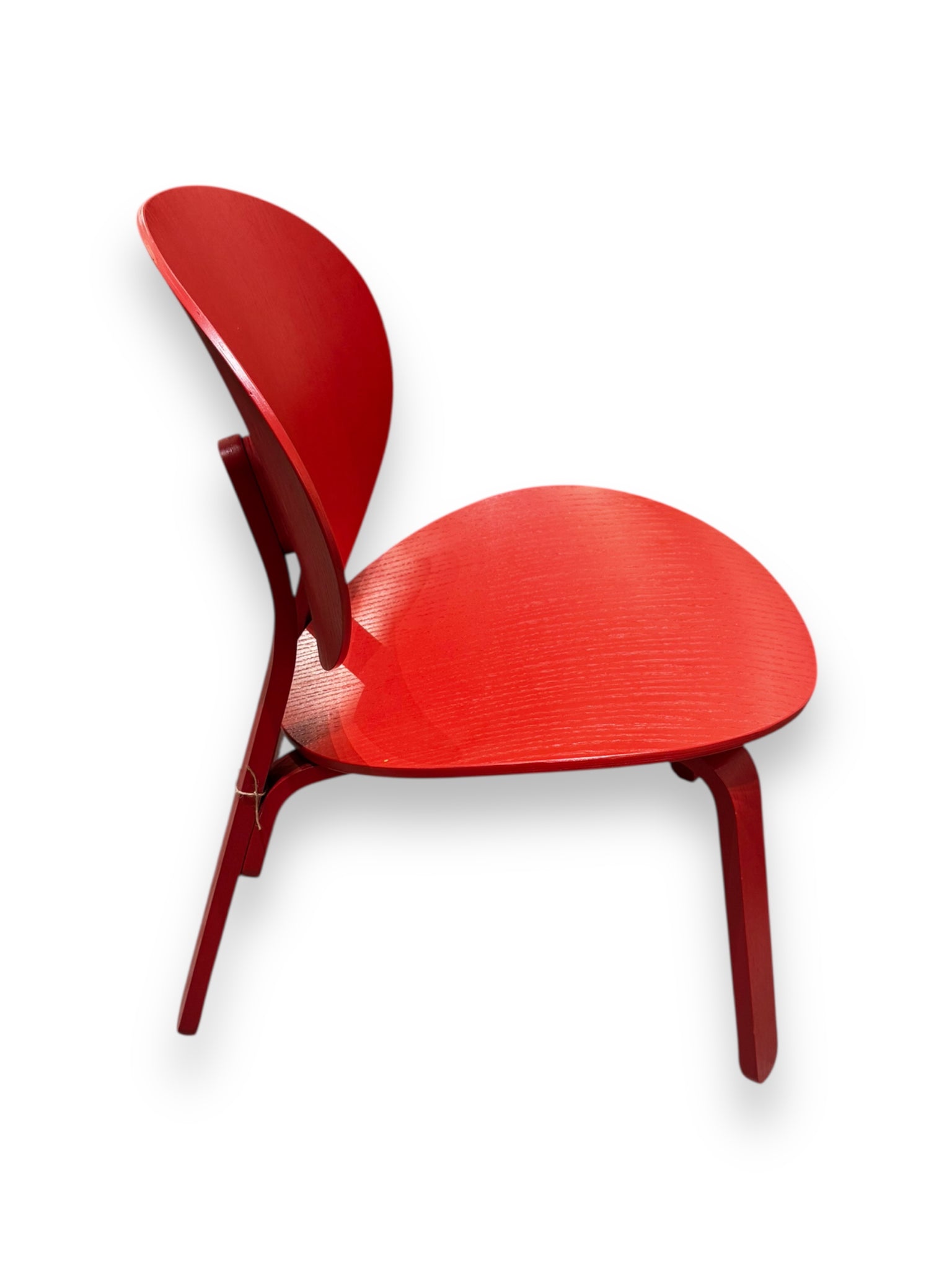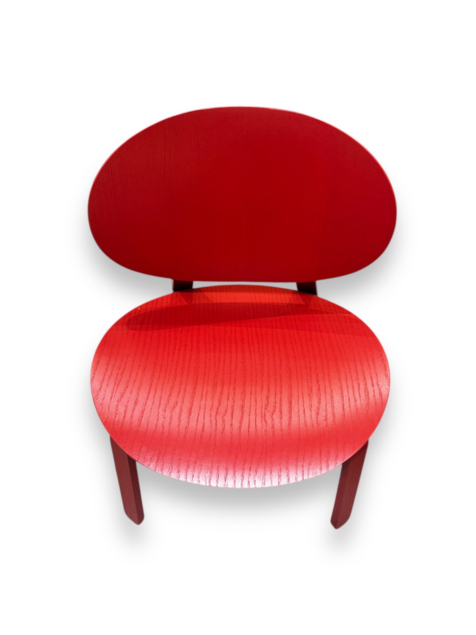 Description: Bold, playful, and full of personality — this modern red accent chair makes a statement from every angle. Crafted from solid wood, it features a smooth, sculpted silhouette with rounded edges and a curved backrest that balances comfort with contemporary style. The vibrant red finish highlights the wood grain beneath, adding depth and visual interest.