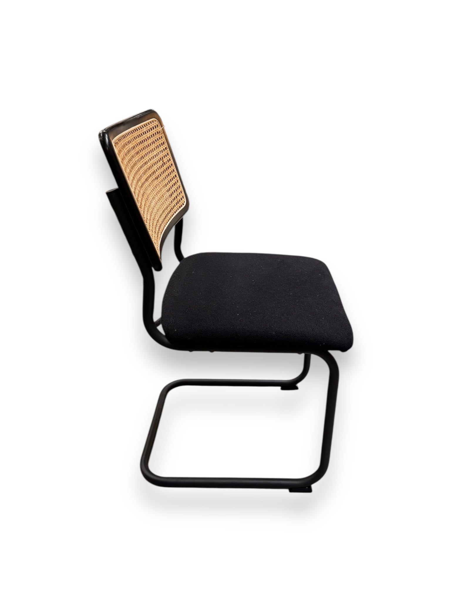 Description: A timeless design with modern appeal, this set of 2 cantilever-style chairs blends sleek lines with natural texture. Each chair features a black tubular metal frame paired with a woven cane backrest that offers lightness and warmth. The seats are upholstered in a soft black fabric, providing comfort while maintaining a clean, minimalist silhouette.