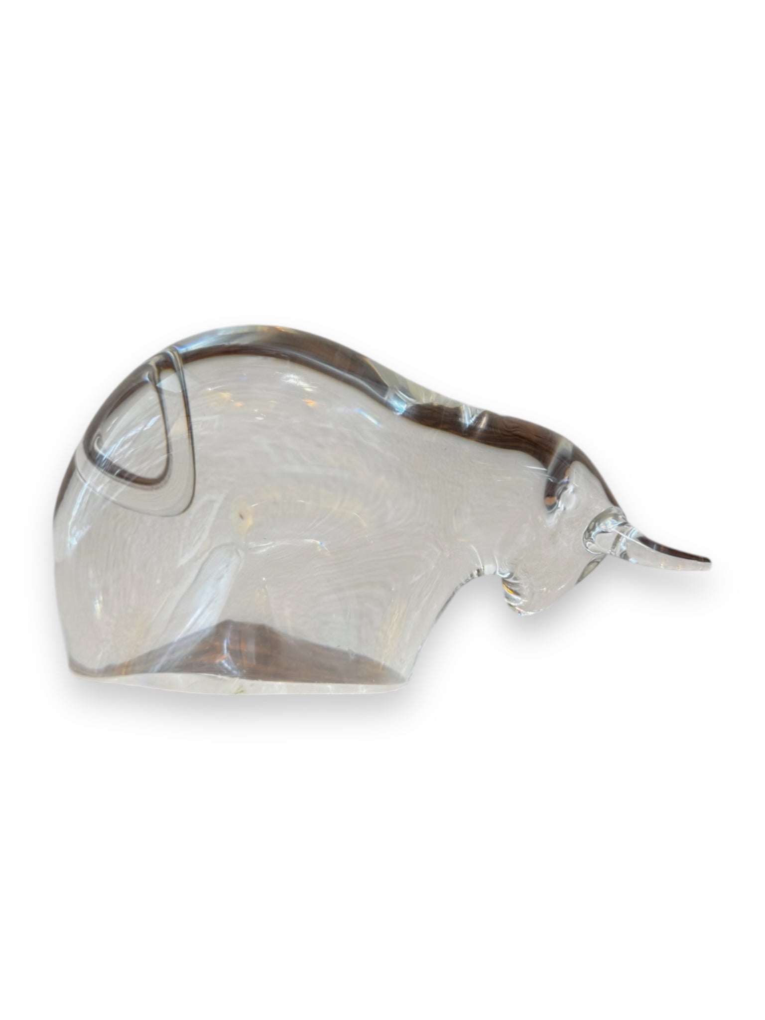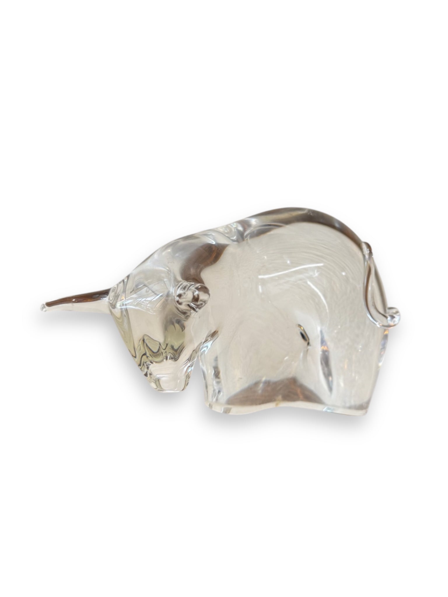 Description: This exquisite Steuben crystal glass bull is a true masterpiece. Crafted with hand blown glass. There are two available sold separately. Both of these figurines are a perfect addition to any collection. The clear glass and glossy finish give these figurines a unique and elegant look that is perfect for any decorative style. The limited edition make this bull rare, and the handmade aspect adds a touch of individuality. This original Steuben product is a commemorative piece that is sure to impress any collector or animal lover. This bull is pre-loved but in excellent condition with no scratches, chips or cracks.