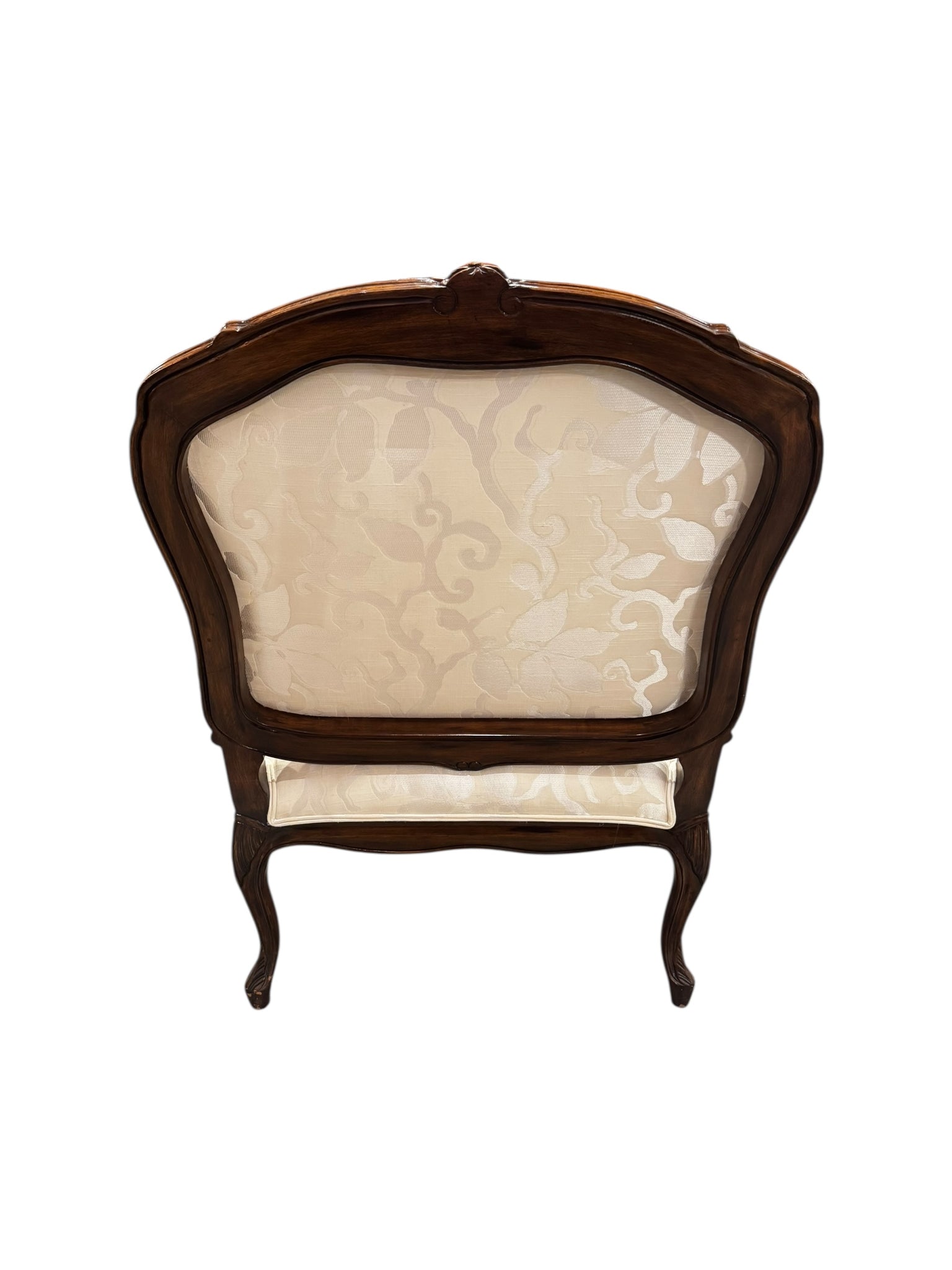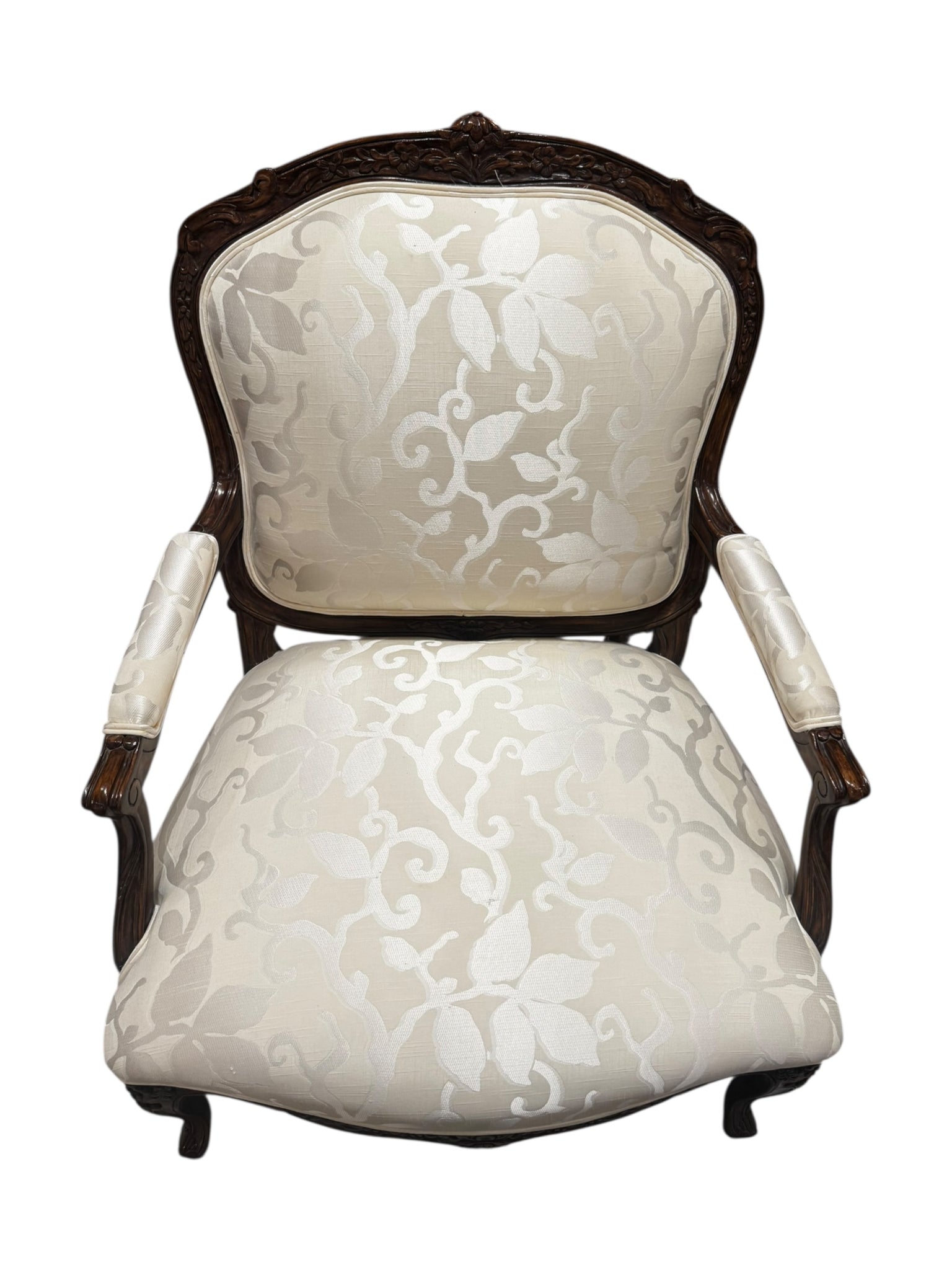 Description: Bring timeless sophistication into your space with this beautifully crafted arm chair. Featuring an intricately carved dark wood frame and freshly upholstered in an ivory jacquard fabric with a subtle botanical pattern, this piece blends classic elegance with inviting comfort. The gently curved arms, cabriole legs, and refined silhouette make it a stunning accent in a living room, bedroom, or reading nook. Whether used as a standalone statement chair or paired as a coordinated set, it adds an elevated, traditional charm to any interior. Condition: Excellent pre-loved condition with minimal signs of wear. Note: Two chairs available; sold separately.