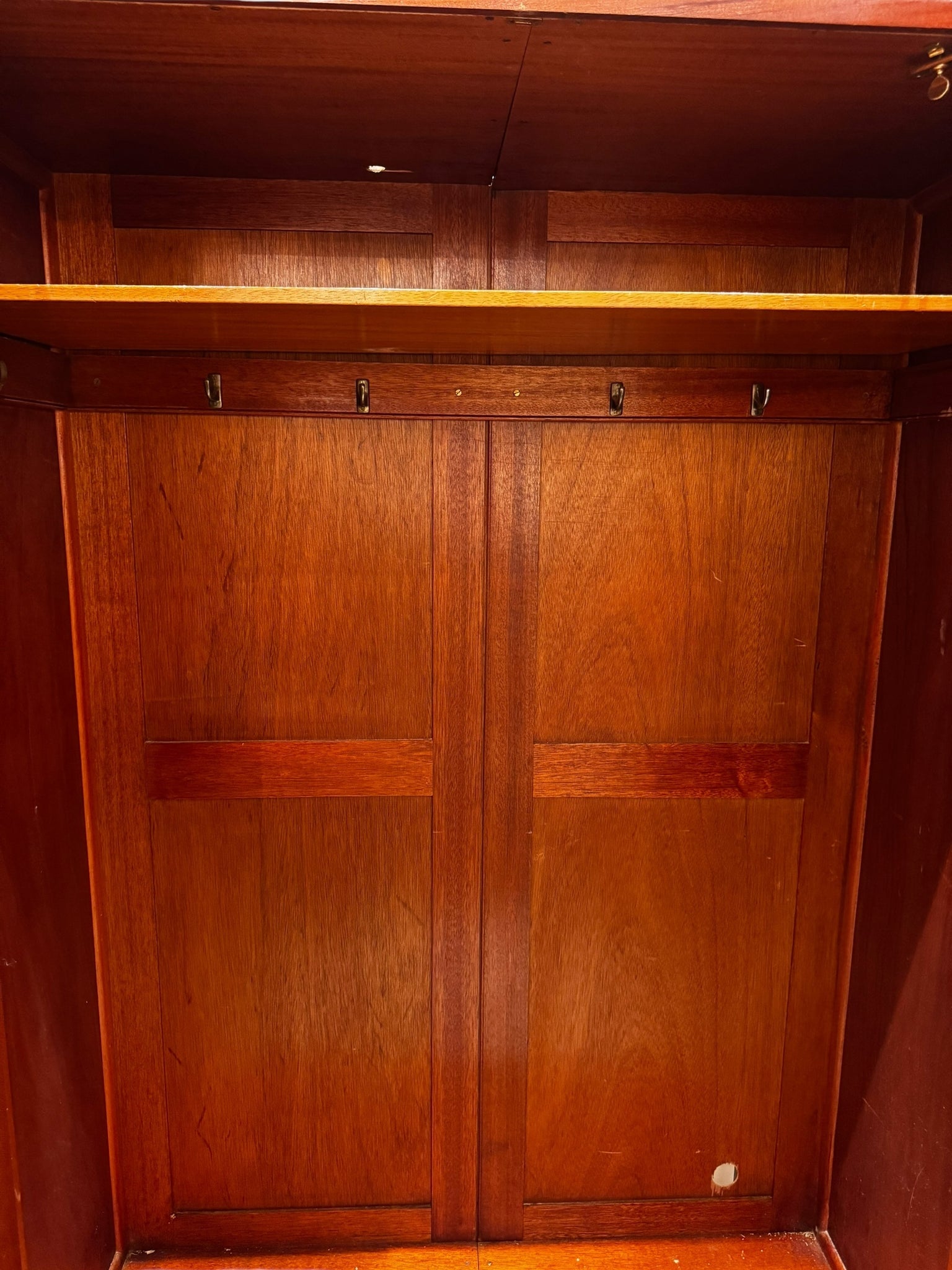 Description: Elevate your space with this stunning vintage armoire, crafted with rich burl wood veneer that showcases an intricate, naturally mirrored grain pattern across the front panels. Its warm, deep tones and rounded Art Deco–inspired edges give it a refined presence, making it a standout piece in any bedroom, hallway, or living area. The interior features a spacious open compartment with an upper shelf and a row of brass hooks—perfect for hanging garments, organizing accessories, or storing linens. Solid wood construction ensures durability, while the original hardware and keyhole detail add a touch of old-world charm. Whether used as a wardrobe, entryway storage, or a statement accent piece, this pre-loved armoire offers both beauty and practicality. A classic addition for those who appreciate fine craftsmanship and timeless design. In good condition.