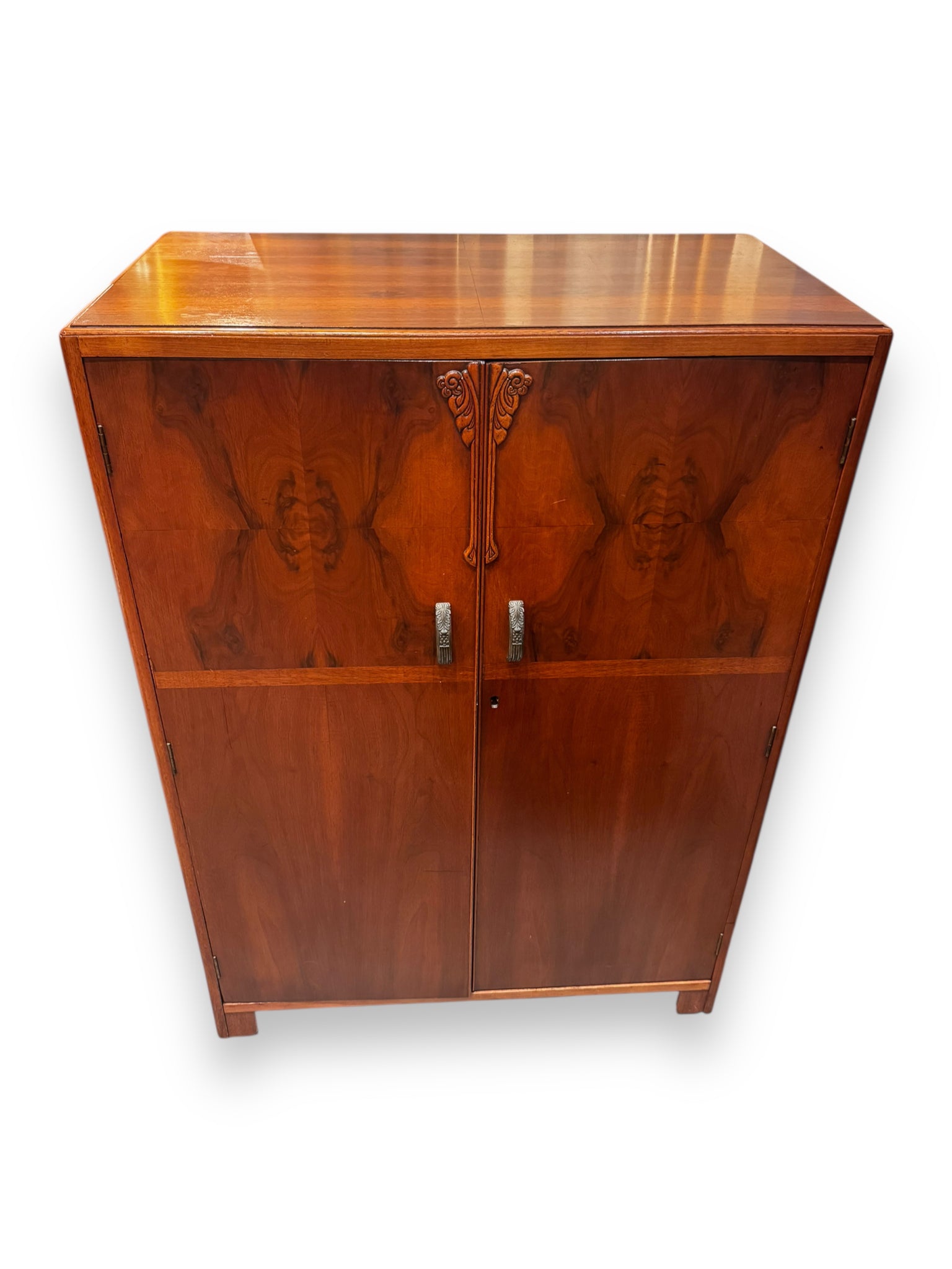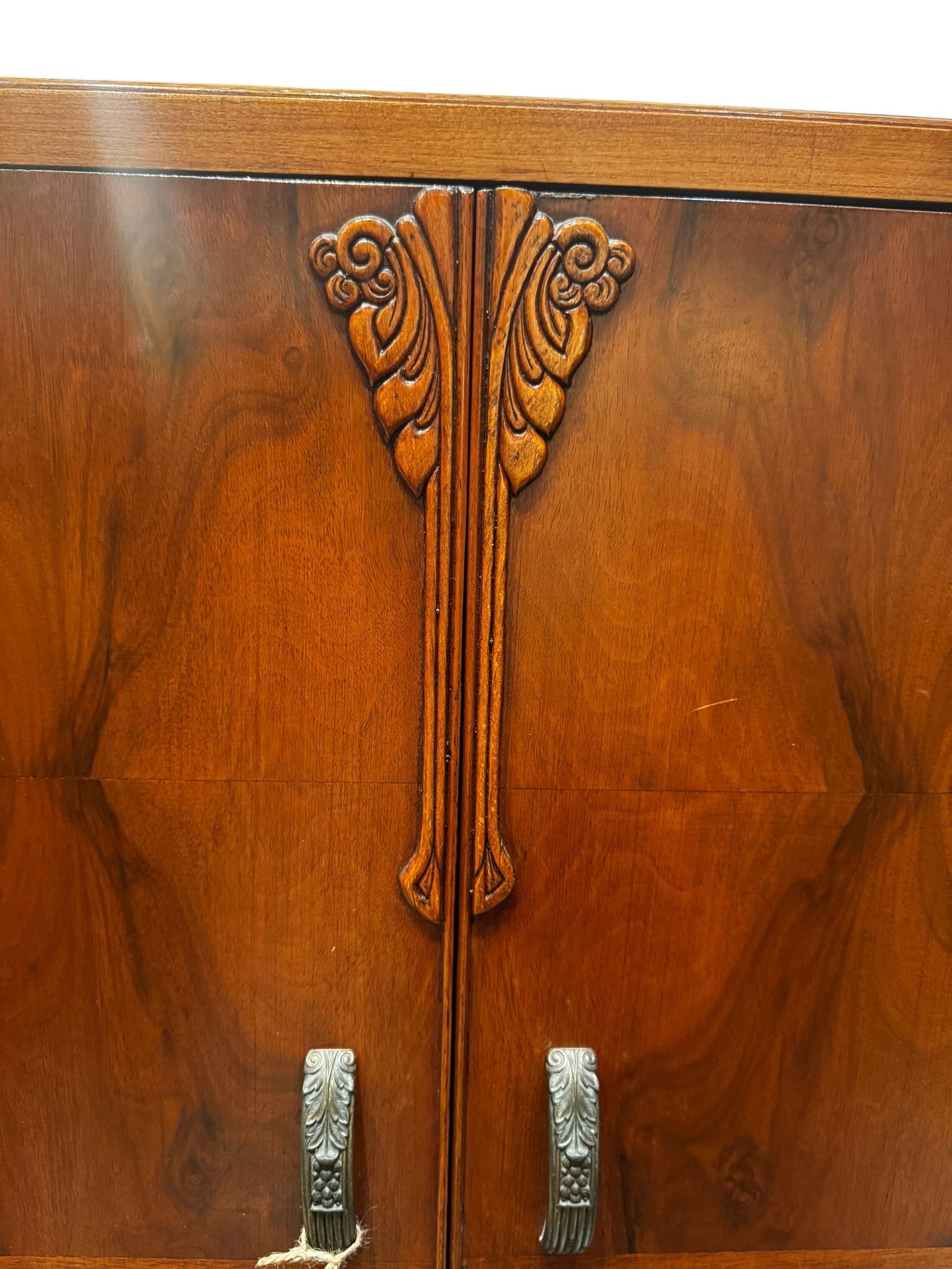 Description: This striking Art Deco walnut cabinet showcases timeless craftsmanship and elegant symmetry. The rich wood grain creates a warm, luxurious presence, while the carved detailing along the center panels and ornate metal pulls add a touch of classic sophistication. Behind the double doors lies ample storage with adjustable shelving — perfect for barware, linens, or collectibles. The piece’s subtle tapering silhouette and decorative accents make it as functional as it is beautiful, ideal for elevating an entryway, dining room, or living space. In good pre-loved condition, with light surface wear consistent with age and use.