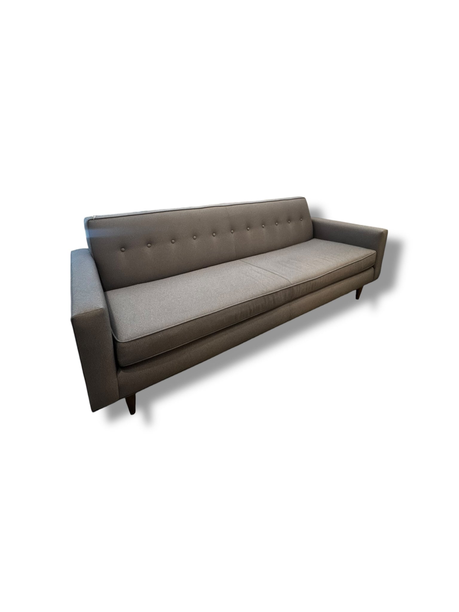 Description: This Design Within Reach gray sofa is a beautifully balanced blend of modern design and everyday comfort. Featuring clean lines, gently sloped arms, and a tailored silhouette, it offers a timeless look that works seamlessly in contemporary, mid-century, or minimalist interiors. The button-tufted back adds subtle visual interest while maintaining a refined, understated feel. Upholstered in a soft, neutral gray fabric, this sofa is both versatile and inviting—easy to style with layered textures, accent pillows, or a statement throw. The generous seat depth and supportive cushions make it comfortable for lounging, entertaining, or everyday living. Pre-loved and in good condition, with light, age-appropriate wear consistent with use, it remains sturdy, clean, and ready for a new home. Two available sold separately.