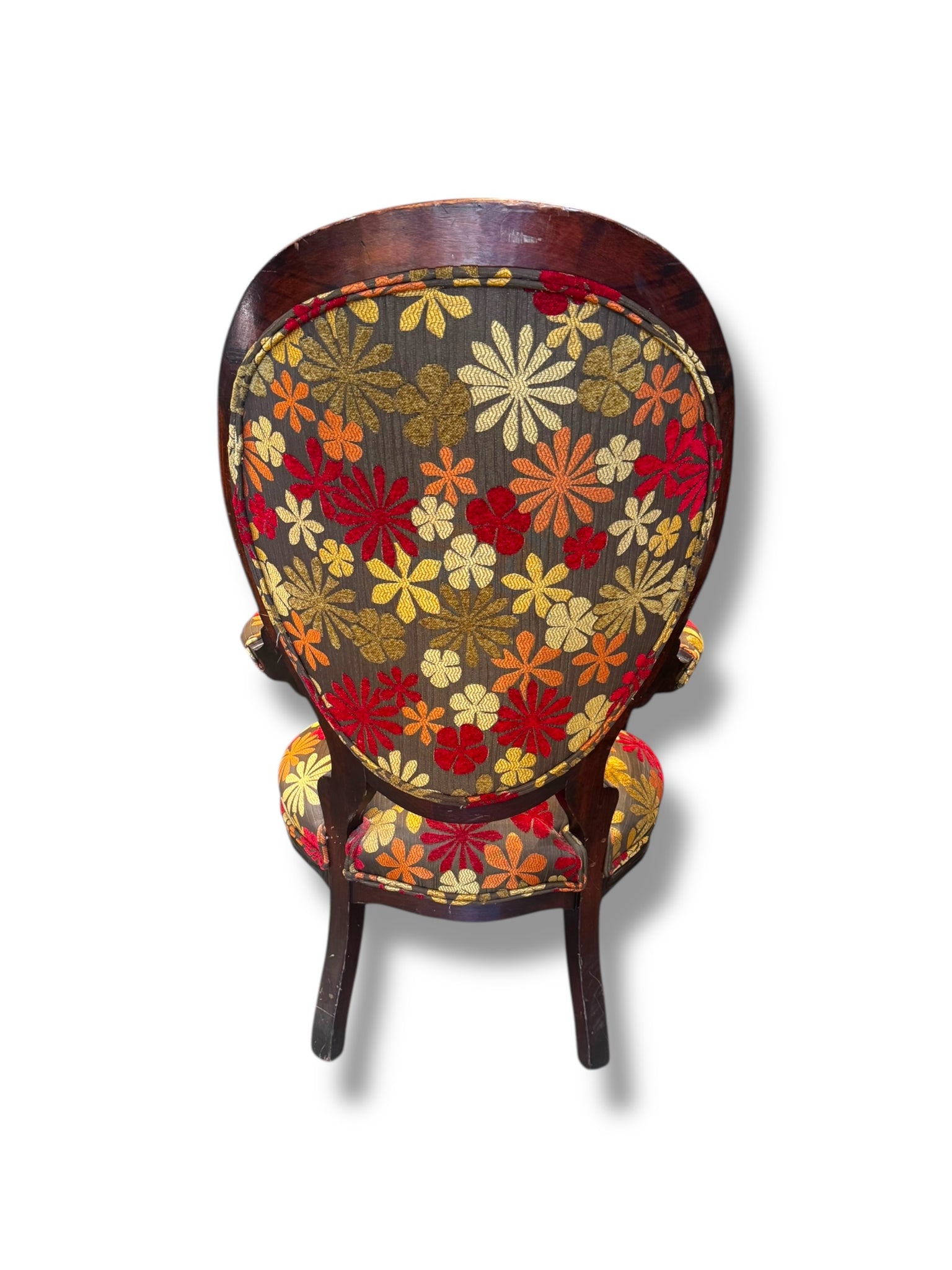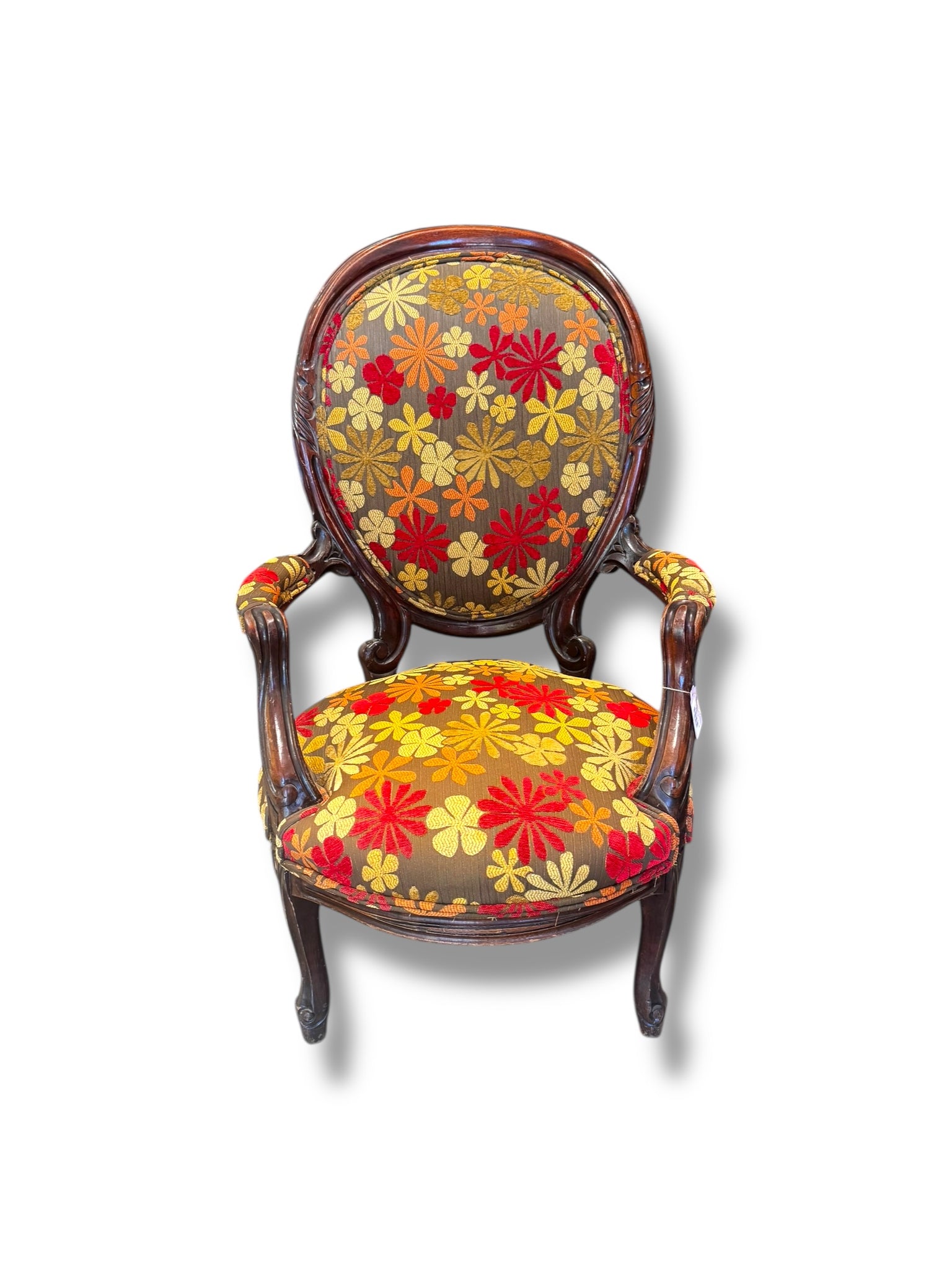 Description: This charming vintage accent chair features a beautifully detailed floral upholstery in rich autumnal tones of red, gold, and warm neutrals. The sculpted wooden frame showcases classic curves and craftsmanship, adding timeless character and elegance to the piece. The fabric retains its vibrant pattern and texture, while the chair remains sturdy and comfortable, making it as functional as it is decorative. In good vintage condition, with light, age-appropriate wear consistent with its history, this piece brings warmth and personality to any space. Perfect as a statement chair in a living room, bedroom, reading nook, or entryway, it pairs effortlessly with both traditional and eclectic interiors. A unique, one-of-a-kind vintage find ready to add character and charm to your home.