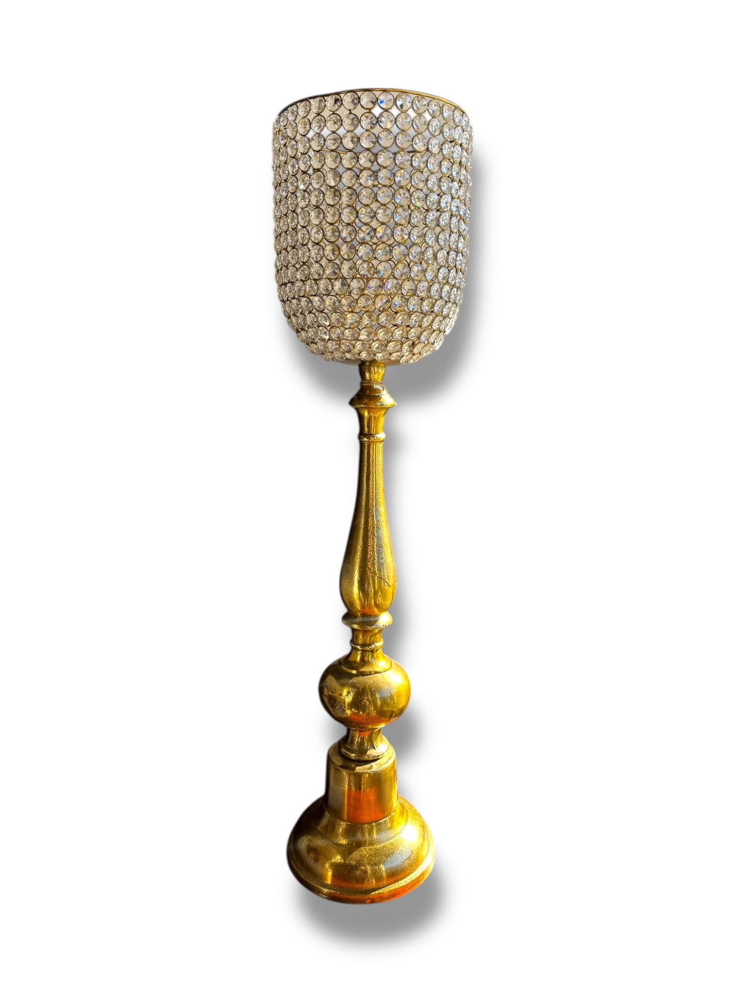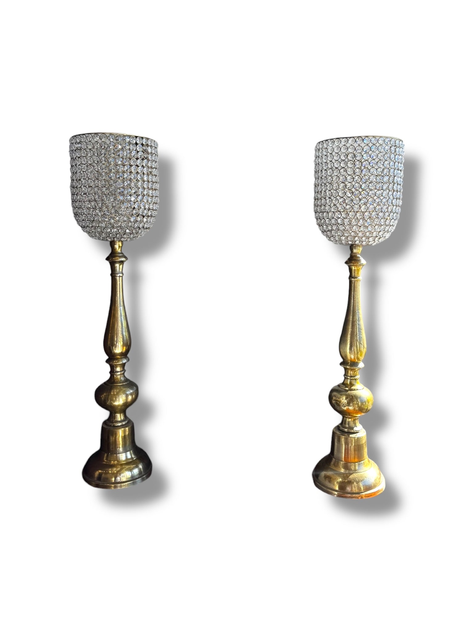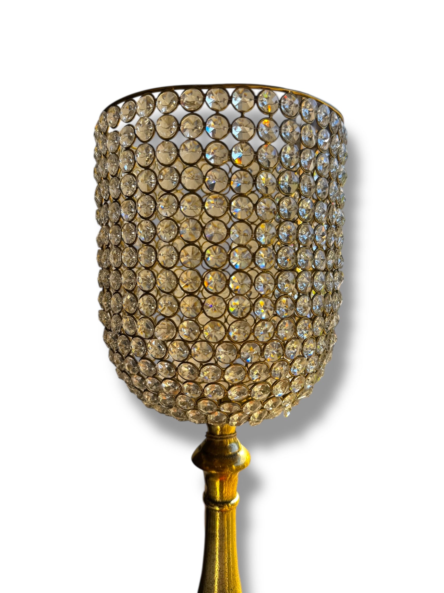 Description: Add instant glamour and warm ambiance to any space with this stunning pair of gold and crystal candle holders. Each piece features a beautifully turned gold-tone metal base topped with a faceted crystal cup that catches and reflects candlelight for a soft, sparkling glow. Whether styled on a dining table, console, mantle, or as part of an event tablescape, these elevate any setting with effortless elegance. Pre-loved and in good condition, these candle holders show light, natural wear consistent with age, adding to their character and charm while remaining fully functional and display-ready.