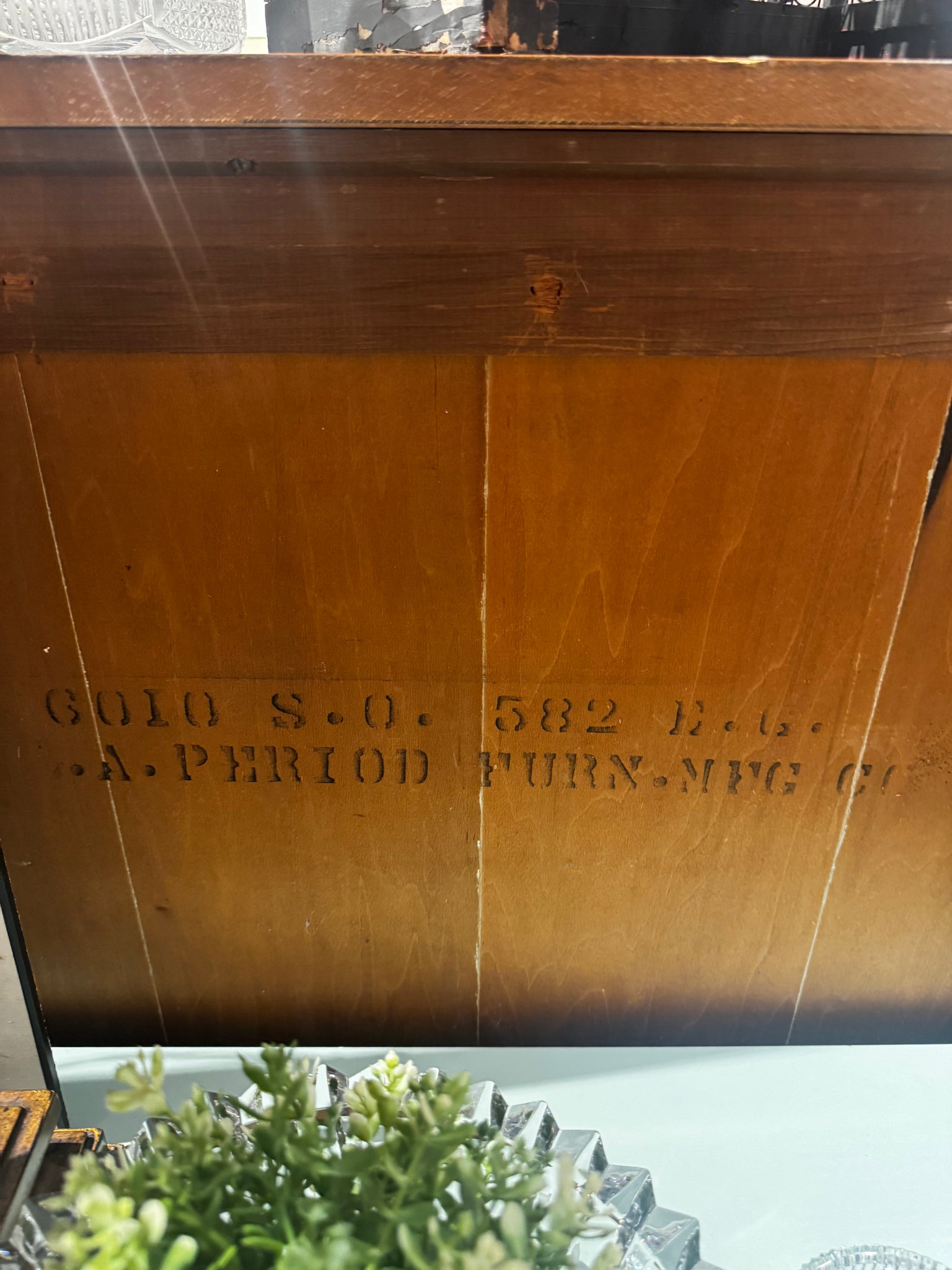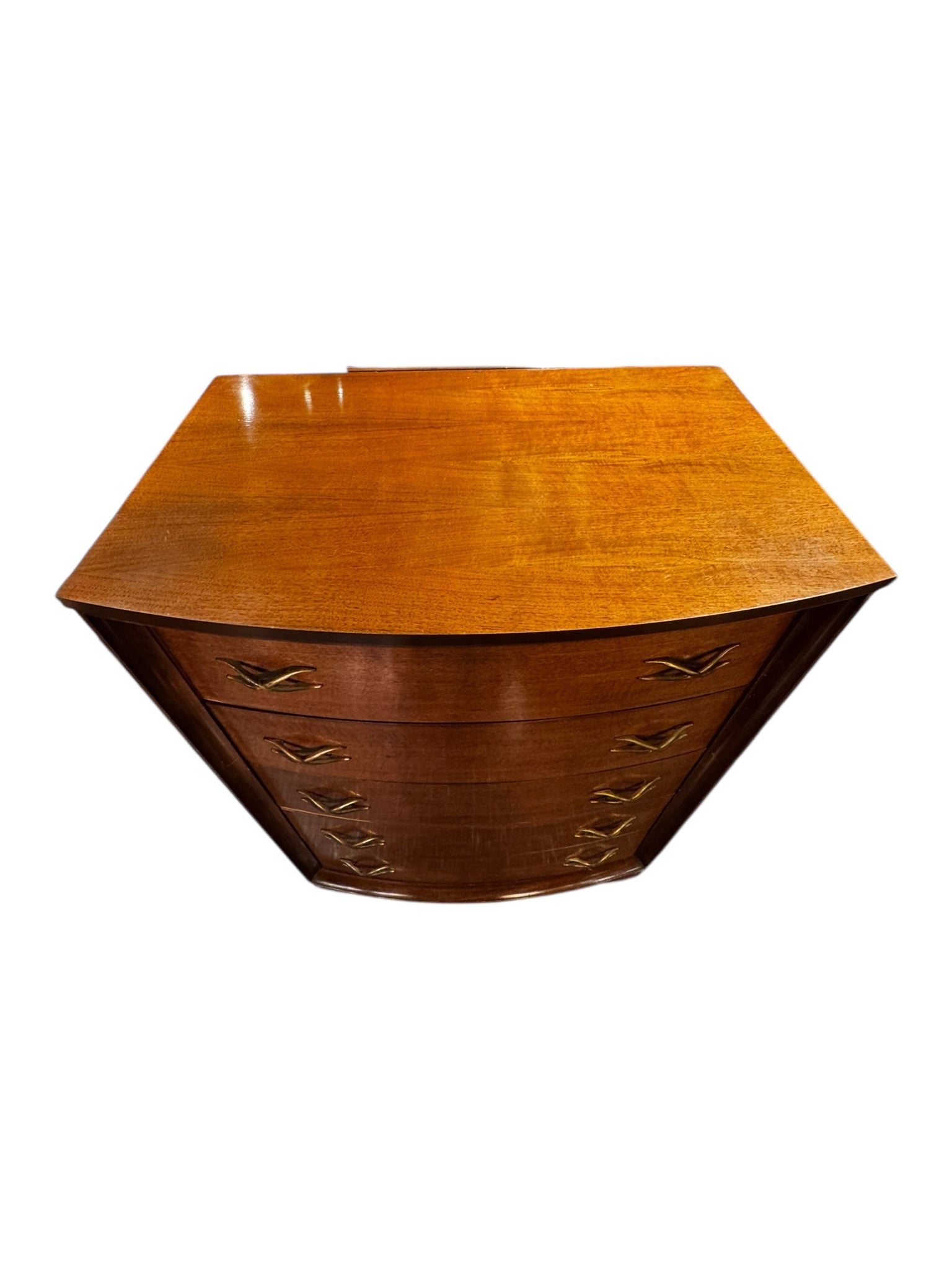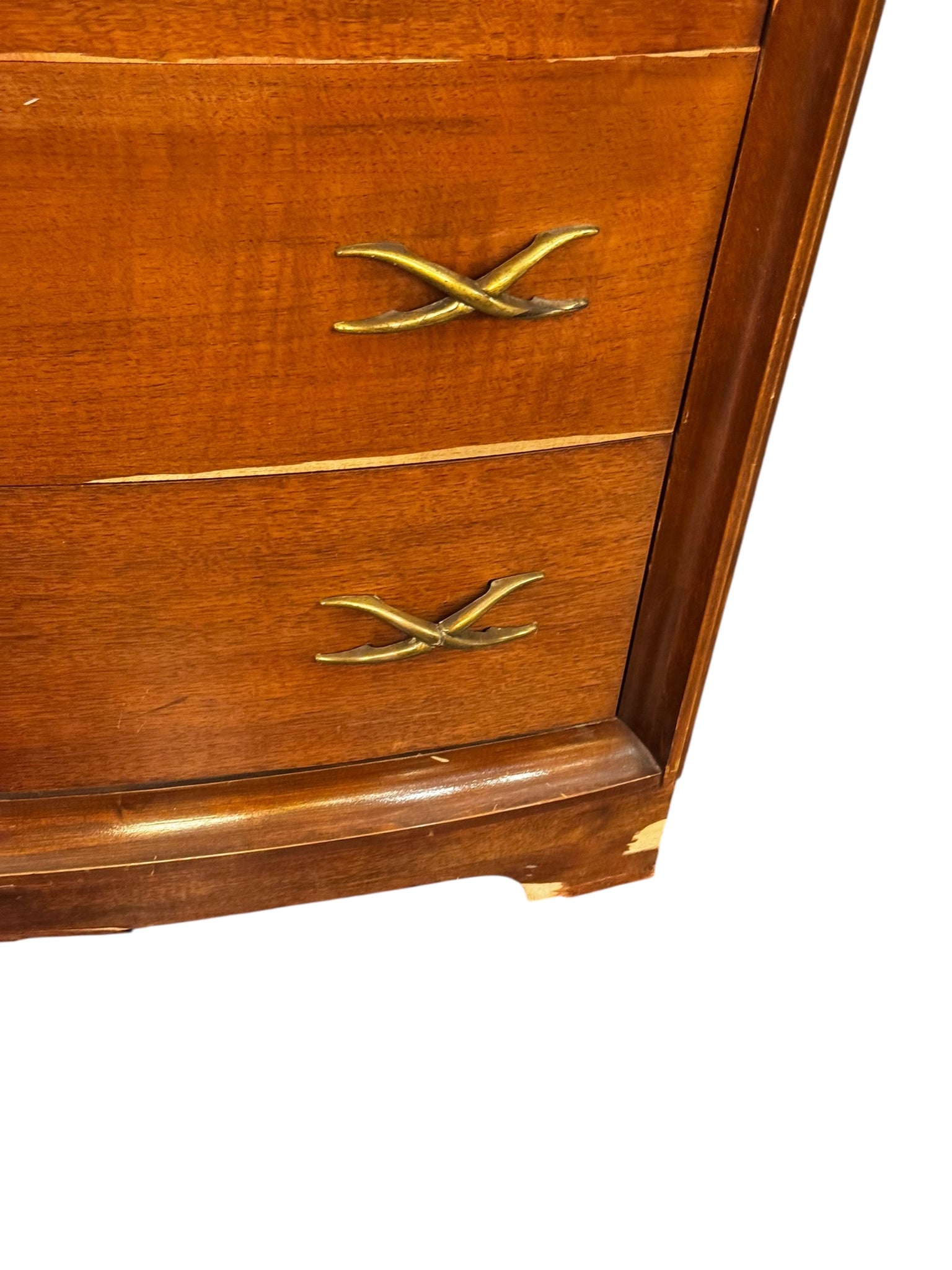Description: Bring iconic mid-century design into your space with this striking Paul Frankl highboy dresser. Known for his sculptural silhouettes and distinctive hardware, Frankl’s pieces are celebrated for their timeless elegance—and this dresser is no exception. Its gently bowed front, warm wood grain, and signature brass “X” pulls create an unmistakable vintage statement. Featuring five spacious drawers, this dresser offers generous storage wrapped in classic mid-century charm. The construction is solid and the drawers glide well, making it as functional as it is stylish. This piece shows notable cosmetic wear consistent with age. Surface scratches, veneer chips (particularly along the lower edges and sides), and finish imperfections are all visible in photos. These do not affect structural integrity and may be suitable for restoration or enjoyed as-is for an authentic vintage look. Perfect for mid-century collectors, designers seeking a statement project piece, or anyone who appreciates the character and craftsmanship of true vintage furniture.