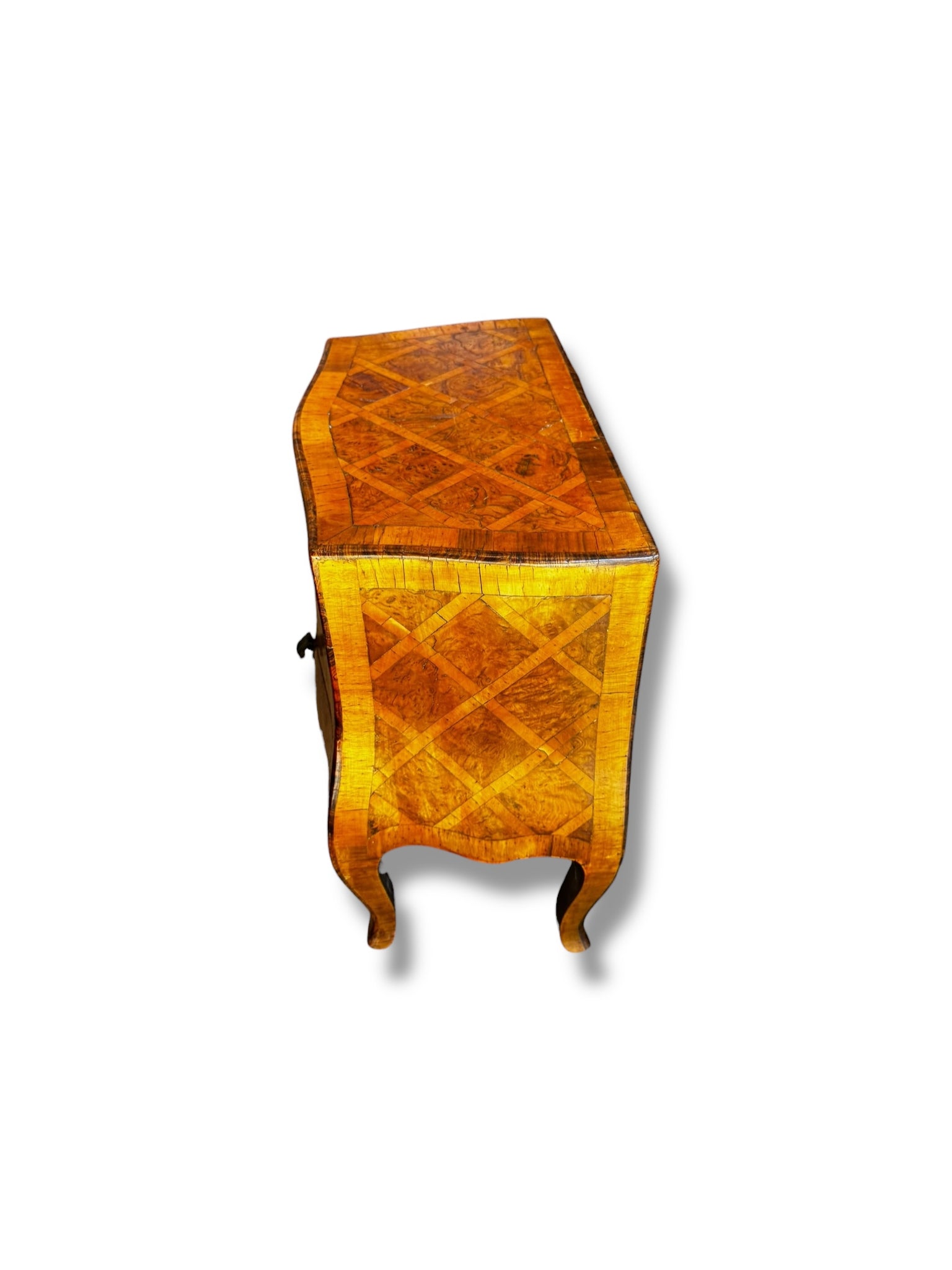 Description: This elegant small commode showcases classic European craftsmanship with a beautifully curved silhouette and intricate wood inlay throughout. Crafted with a warm, honey-toned veneer arranged in a geometric parquet pattern, it highlights the natural movement and character of the wood from every angle. The gently bombé front, cabriole legs, and scalloped apron lend it a refined, old-world presence. Featuring three smoothly functioning drawers with original metal pulls, this piece offers practical storage while remaining visually light and graceful. The compact scale makes it especially versatile—perfect as a bedside table, entryway accent, or statement piece in a living space. Pre-loved and in good vintage condition, with age-appropriate wear that adds to its charm and authenticity. A timeless piece that brings warmth, history, and sophistication to any interior.
