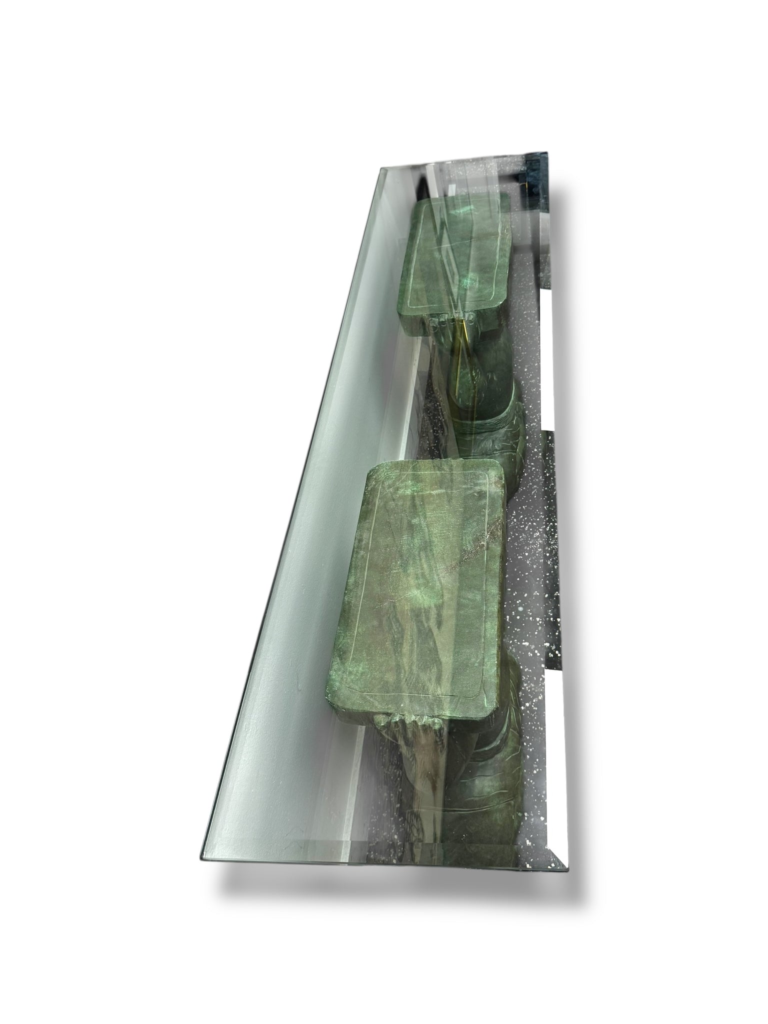 Description: A striking statement piece, this pre-loved console table features a thick glass top supported by two sculptural Buddha-style figures in a seated pose, each holding the tabletop aloft. Finished in a rich verdigris-style patina, the bases have an aged bronze look that adds depth, character, and artistic presence. The long rectangular glass top keeps the design visually light while showcasing the detailed sculptural supports below—making it perfect for an entryway, hallway, or behind a sofa. It blends beautifully with eclectic, global, and contemporary interiors. In good pre-loved condition with light, age-appropriate wear to the bases and glass. A bold, conversation-starting piece that doubles as functional art.