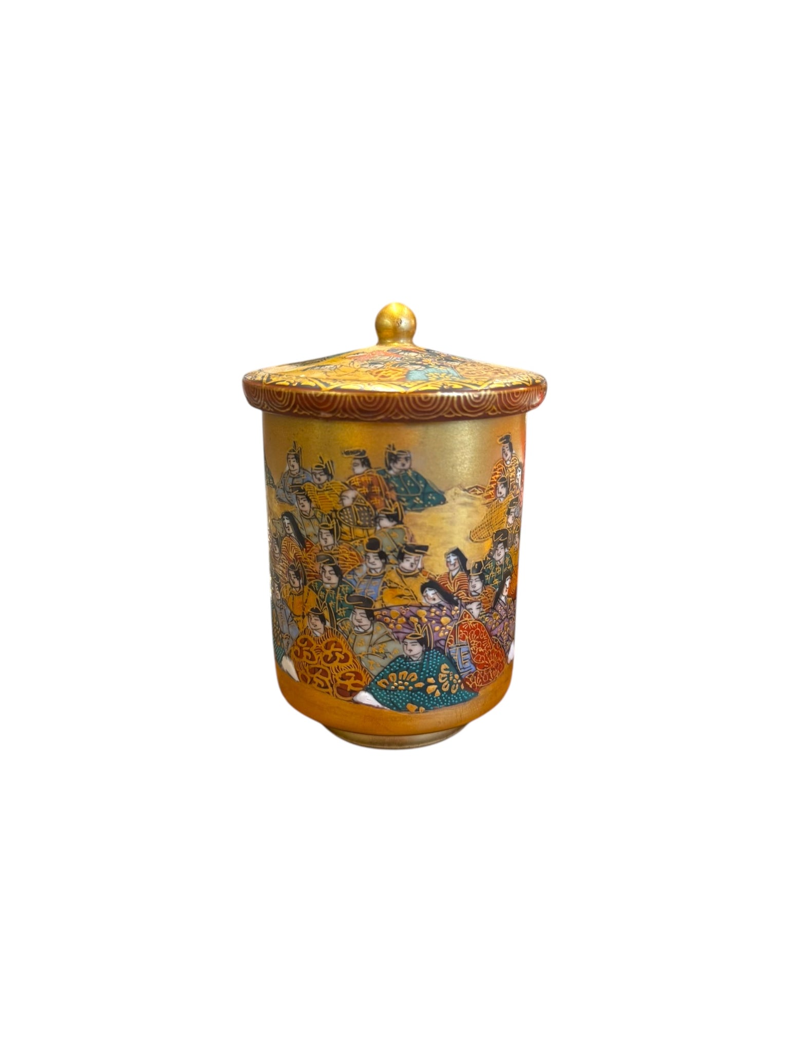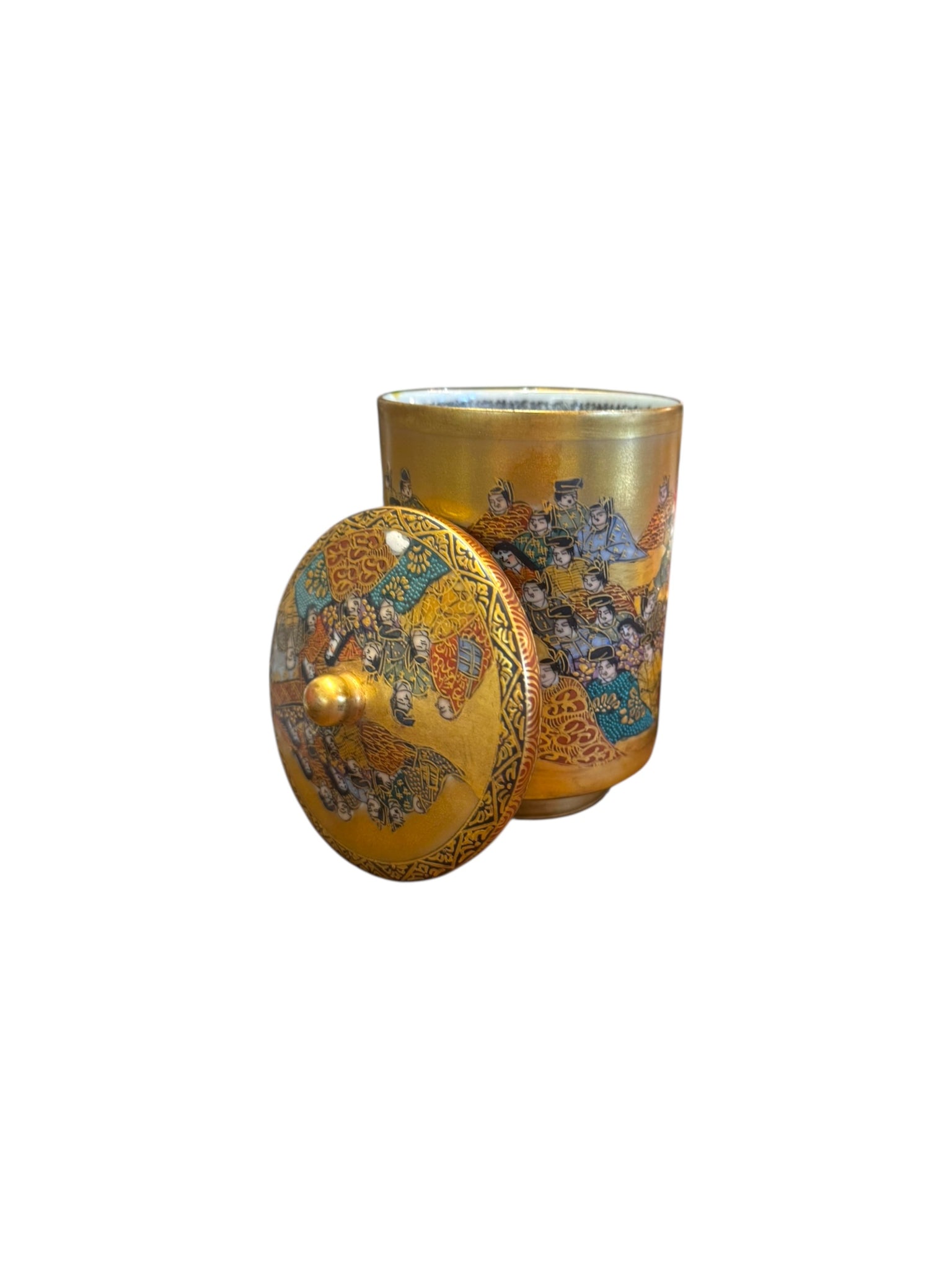 Description: Set of two Japanese Hand Painted Satsuma wedding cups with lids and stands. Circa 1900-1910. Signed on bottom.