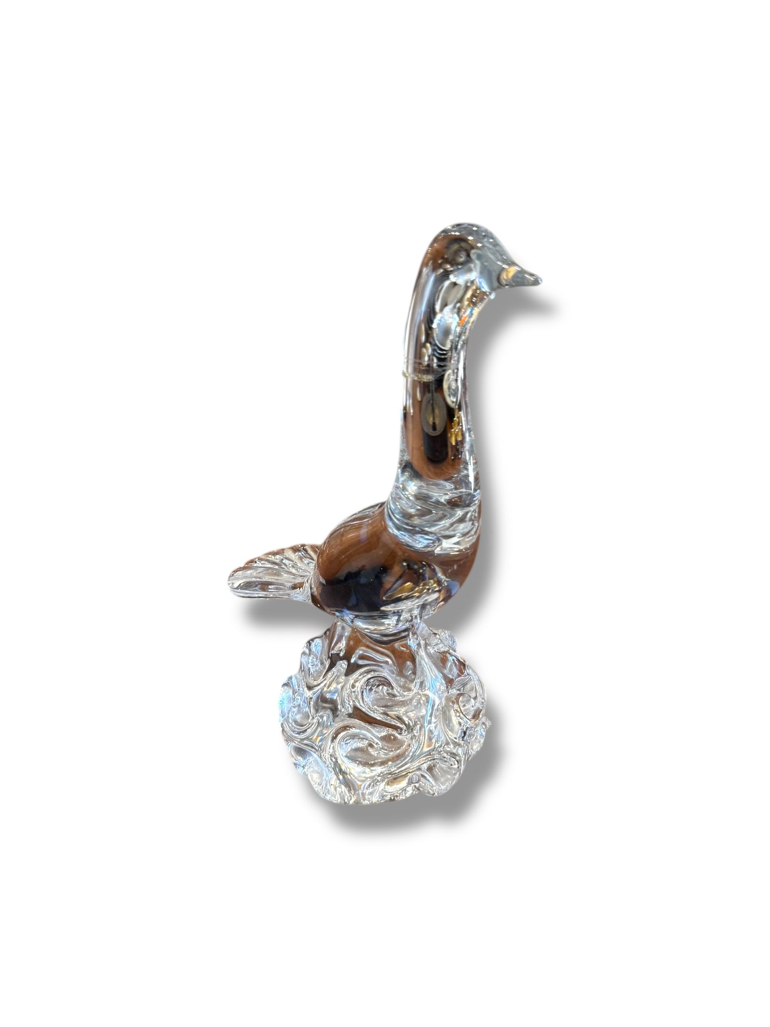 Description: This elegant Baccarat crystal bird is a stunning example of fine French crystal artistry, featuring flowing amber and clear tones that catch the light beautifully from every angle. Perched on a sculptural, swirling crystal base, the bird’s graceful form feels both timeless and dynamic—making it a captivating accent for any interior. The piece is pre-loved and in good condition, with natural signs of age consistent with careful display. A Baccarat maker’s mark on the bottom confirms its authenticity and heritage as a collectible from one of the world’s most renowned crystal houses.