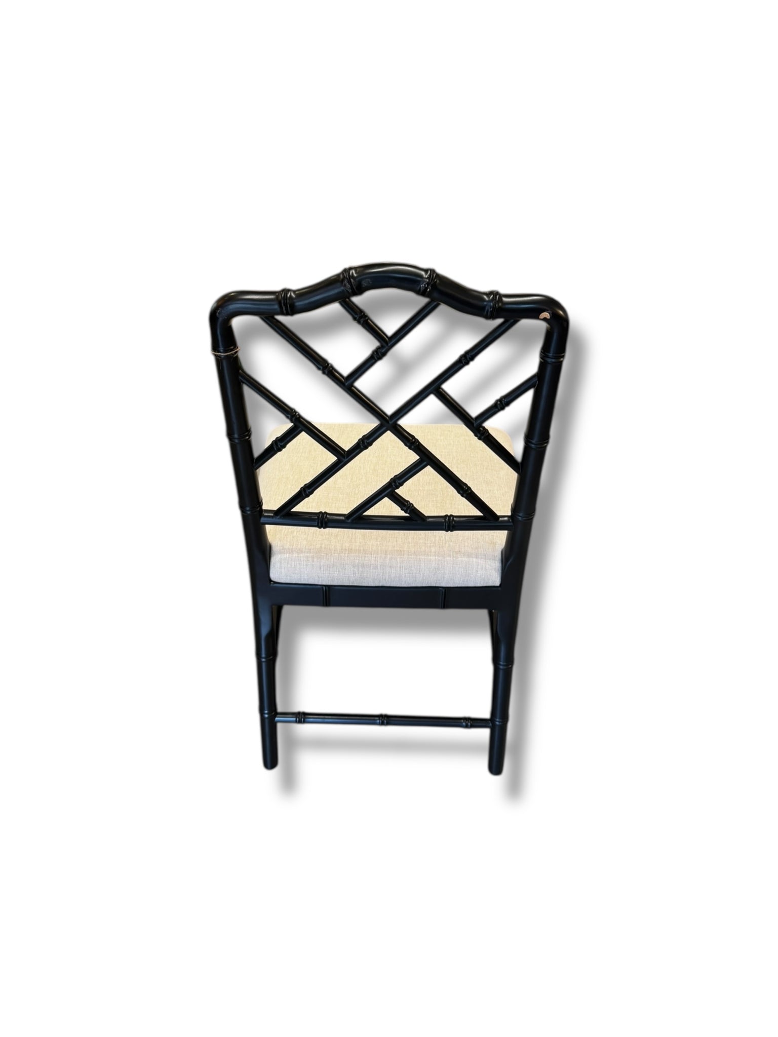Description: Add a touch of timeless charm to your space with this chic faux bamboo dining chair. Finished in a sleek black lacquer, the frame features intricate Chippendale-style latticework that blends classic design with a fresh, modern edge. The neutral upholstered seat offers comfortable support and pairs effortlessly with a variety of décor styles — from coastal and traditional to contemporary and eclectic.