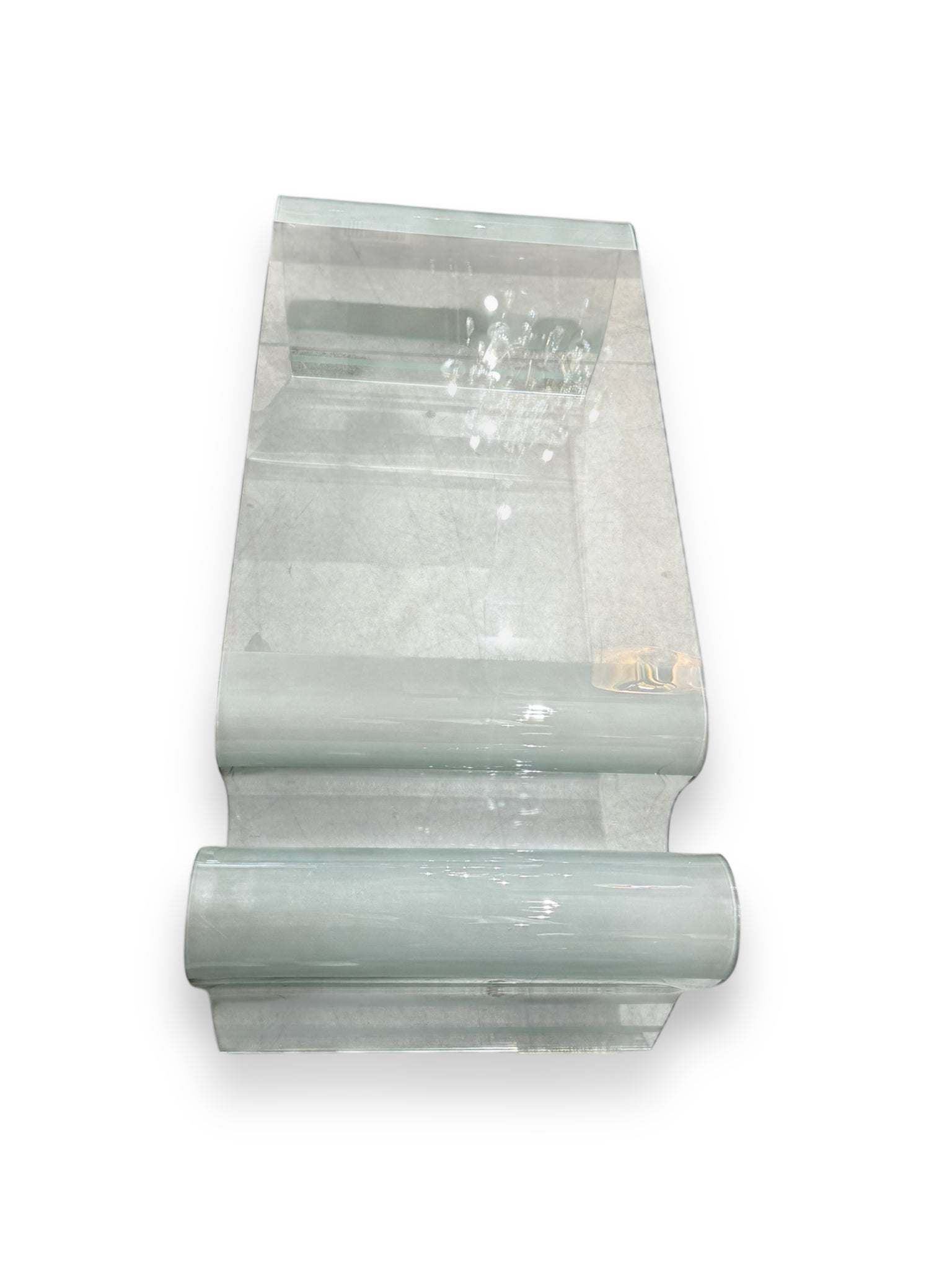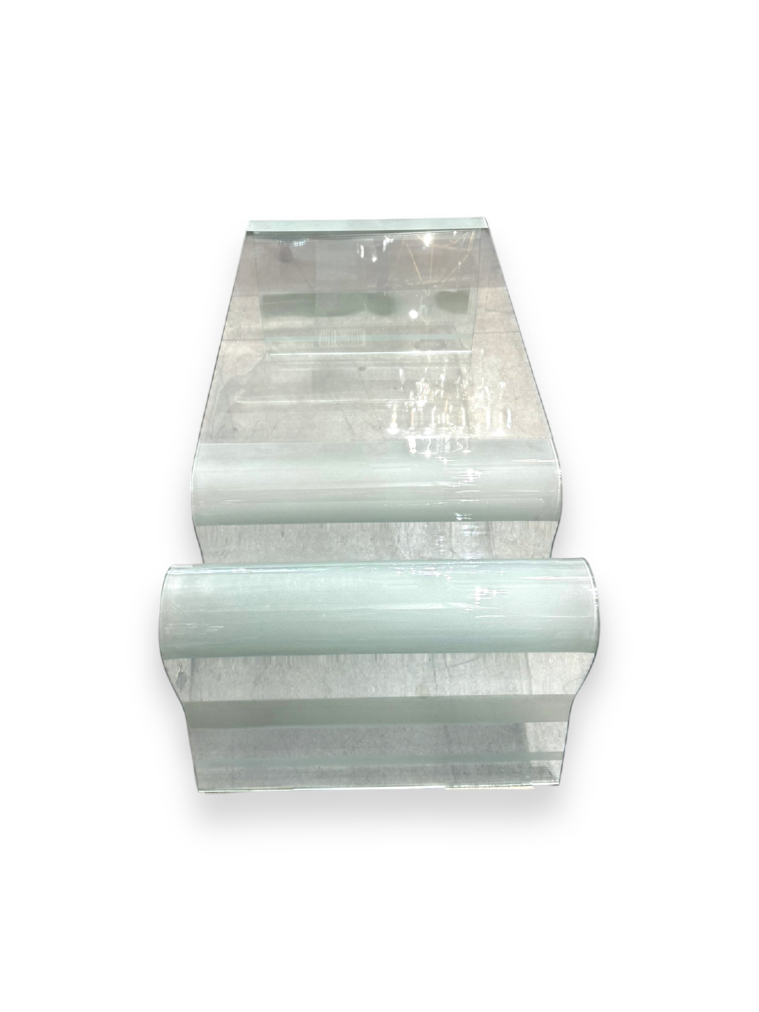 Description: Sleek, sculptural, and effortlessly modern — this bent glass coffee table is a statement piece of contemporary design. Crafted from a single sheet of thick glass, it features smooth, fluid curves that form both the tabletop and a secondary tier for books, decor, or magazines. The transparent design creates an open, airy feel, making it a perfect fit for modern, minimalist, or art-inspired interiors. Its curved edges and seamless construction highlight both craftsmanship and sophistication. In good pre-loved condition, showing light surface wear consistent with age and use.