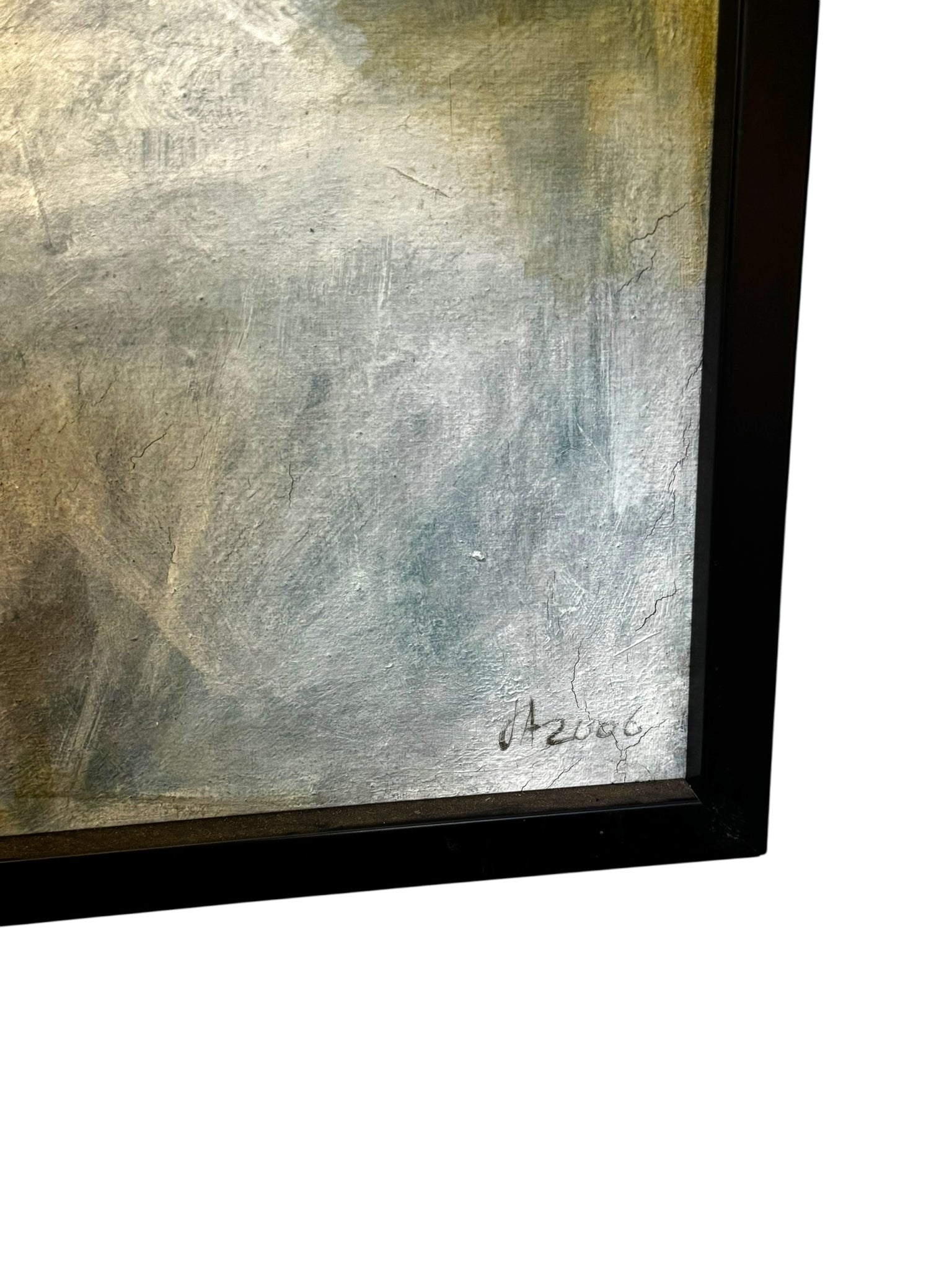 Description: Original signed painting titled “El Jinete” by artist Sharon Lee Andreasen, acquired directly from the artist’s family and never previously owned. This compelling composition captures a quiet, introspective moment, with a mounted figure and accompanying subjects rendered in a soft, atmospheric palette. The piece is rich in texture, with visible brushwork and layered tones that create depth and movement throughout. Muted hues of gray, cream, and deep green give the painting a timeless, almost ethereal quality, while the subject matter evokes a narrative that feels both grounded and elusive. Framed and ready to display, this work carries the authenticity and provenance that collectors appreciate—an original piece with a direct connection to the artist. A subtle chip on the frame is present, consistent with light handling, and does not detract from the overall presentation (see photos). A striking and thoughtful addition to any art collection or interior space, offering both visual impact and meaningful origin.