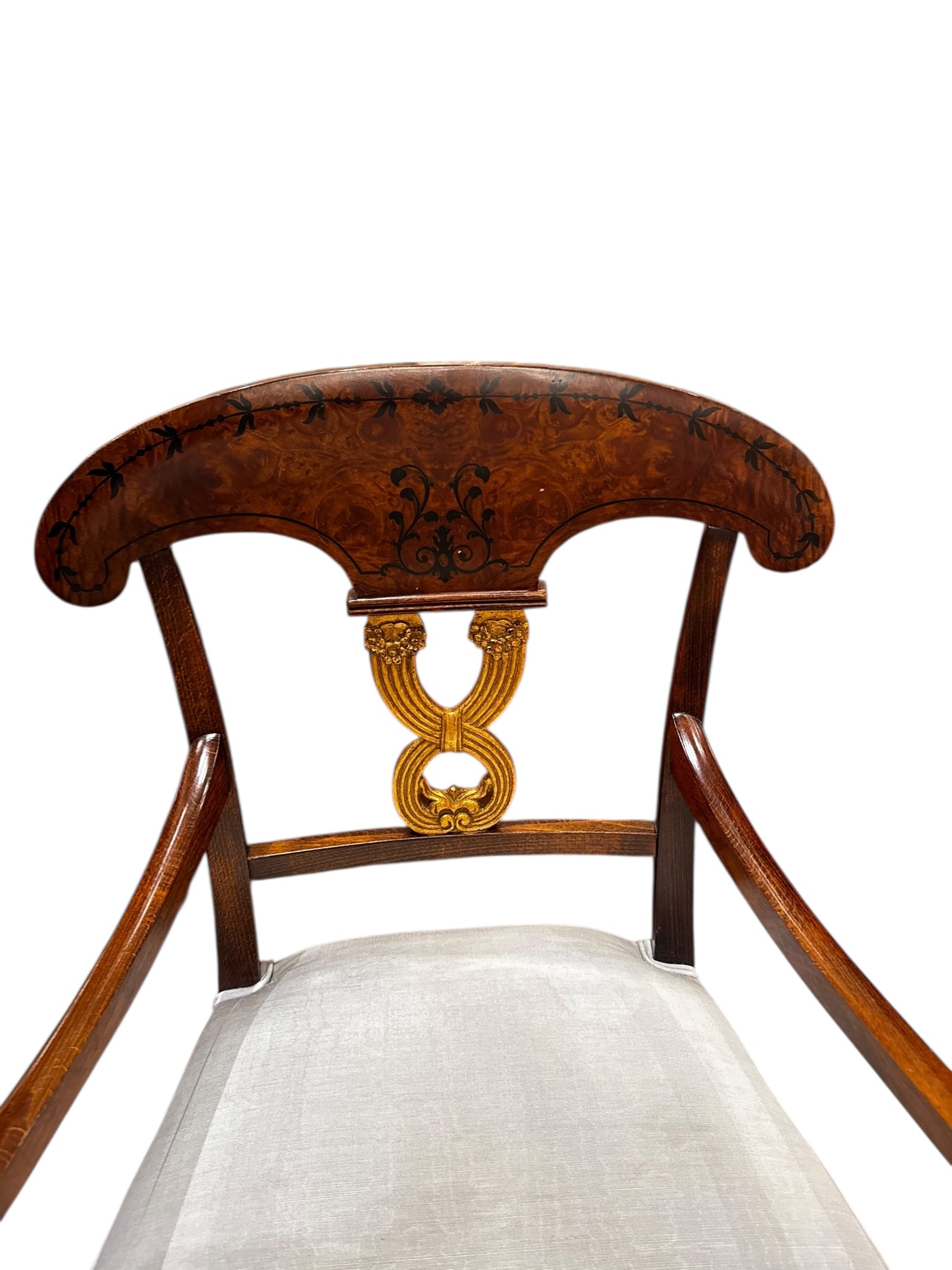 Description: This elegant set of two pre-loved accent chairs features rich wood frames with graceful curved arms and beautifully detailed backs accented by subtle gilded elements. The upholstered seats offer comfortable support while maintaining a refined, timeless silhouette. Perfect for a dining setting, office, or as statement accent chairs in a living space. Pre-loved and in good condition, with light, age-appropriate wear that adds to their character. A sophisticated pair that brings warmth, charm, and classic style to any room.