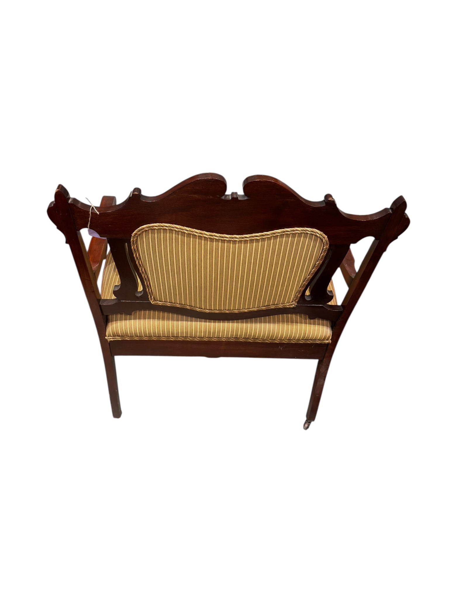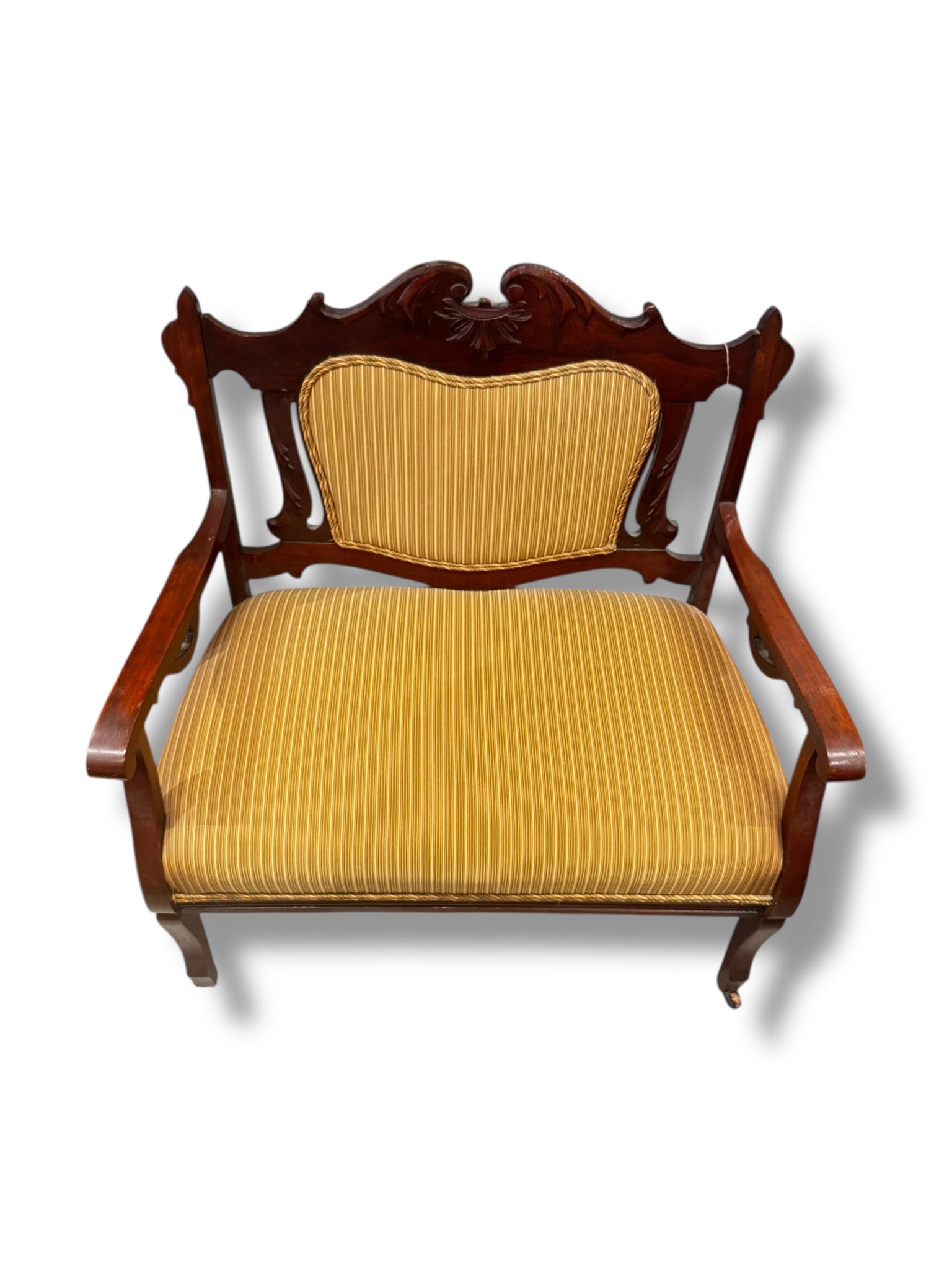 Description: This charming pre-loved loveseat on wheels blends classic craftsmanship with practical versatility. Crafted from rich, warm-toned wood, it features elegant carved details, gently curved arms, and a beautifully shaped back that give it timeless appeal. The upholstered seat and back cushions are finished in a soft, striped fabric that adds warmth and subtle texture. Set on functional casters, this piece moves easily—perfect for flexible seating in a living room, library, bedroom, or entryway. In good pre-loved condition, it shows light, age-appropriate wear consistent with vintage furniture, without detracting from its comfort or character. A lovely statement piece that offers both style and function, ideal for those who appreciate classic design with a lived-in, collected feel.