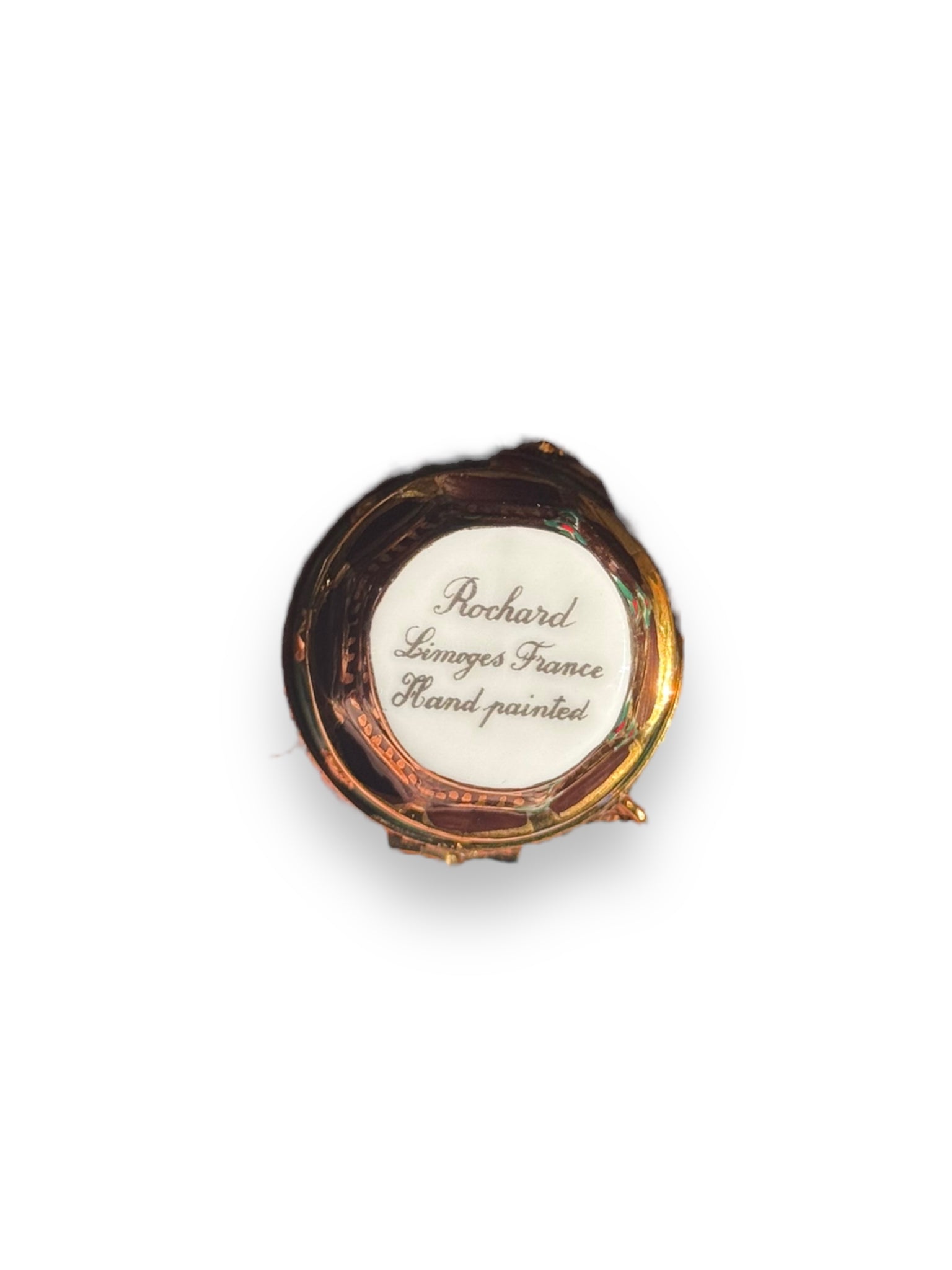 Description: Add a touch of French holiday magic to your collection with this exquisite Richard Limoges hand-painted porcelain piece. Crafted in Limoges, France, this collectible features Santa Claus riding in a gilded green hot air balloon, detailed with festive red ribbons and gold accents. The balloon opens on delicate chains to reveal a hidden compartment — a signature touch of Limoges artistry. A beautiful blend of whimsy and craftsmanship, this heirloom-quality piece stands on a graceful brass stand and makes a stunning addition to any holiday display or fine porcelain collection. Item is pre-loved but in good condition.