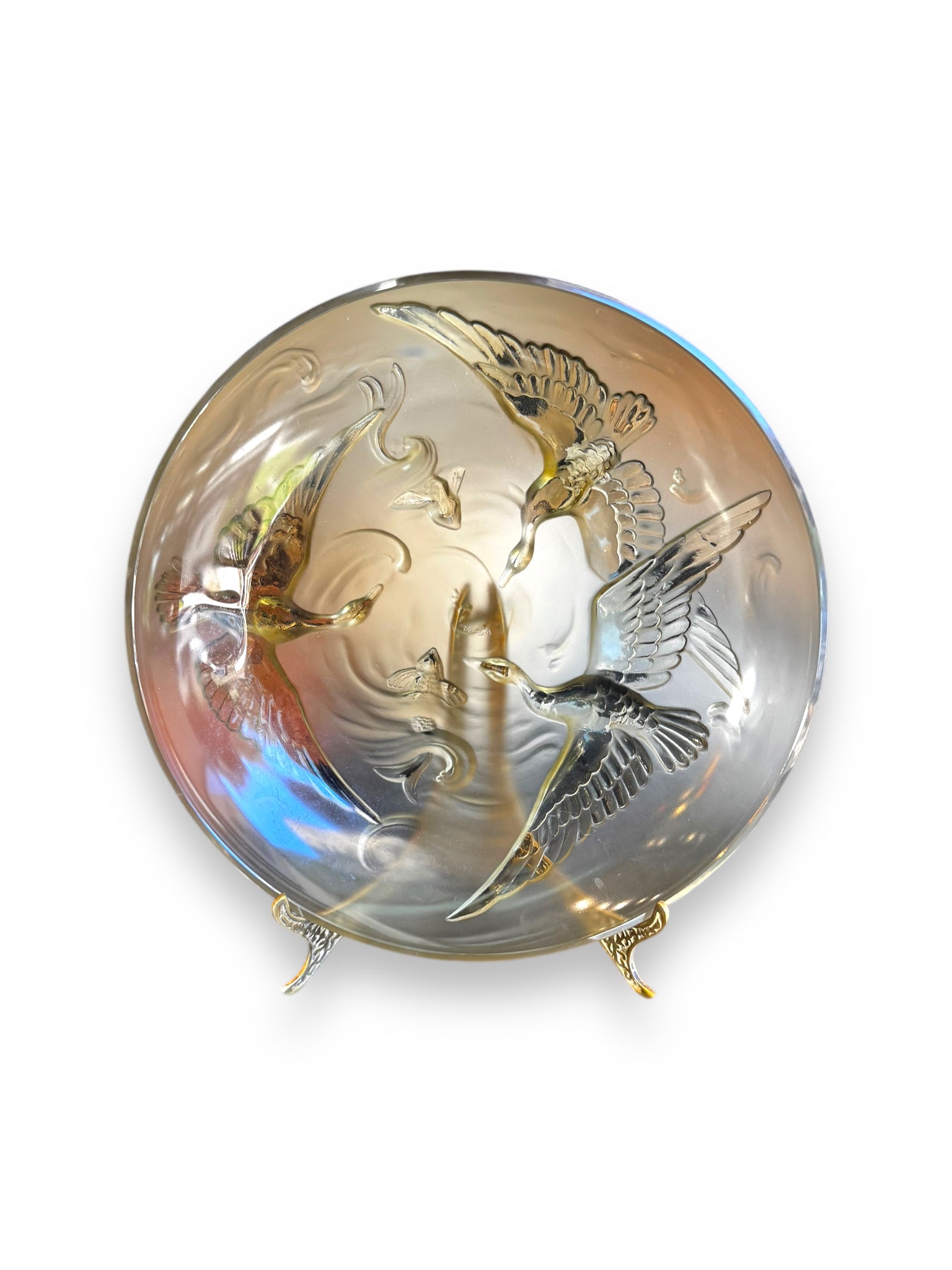 Description: This stunning vintage Verlys plate features beautifully sculpted flying cranes, captured in fluid motion across luminous opalescent glass. The piece shifts softly in the light, revealing delicate pearlescent tones that highlight its detailed relief work. Pre-loved and in excellent vintage condition, it’s a striking display piece for collectors of fine art glass.